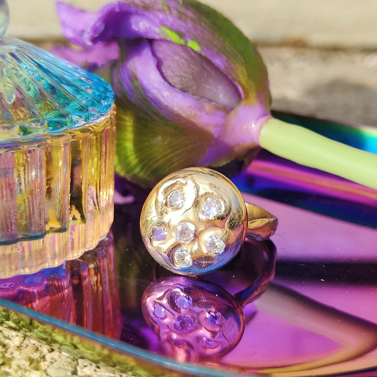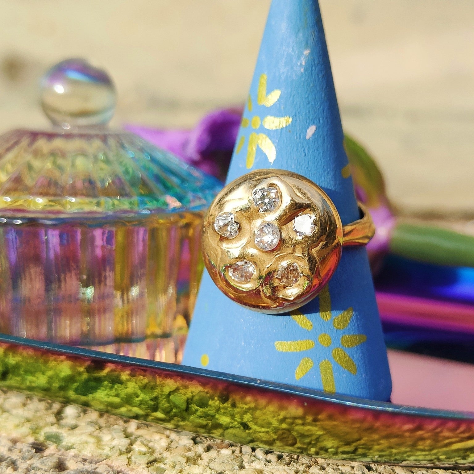 Anello in bronzo giallo con zirconia incastonati in una base rotonda.