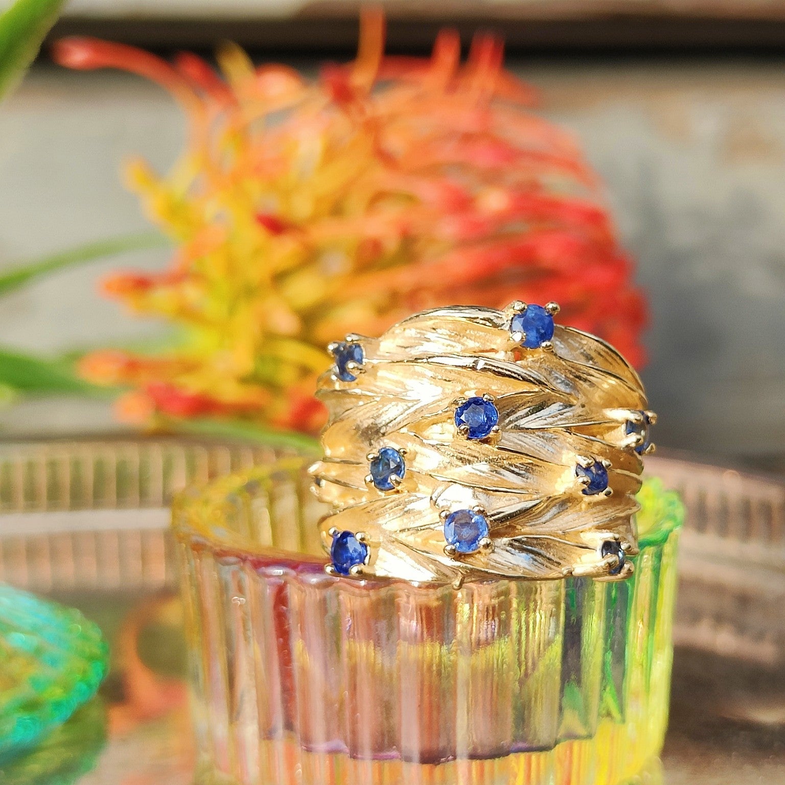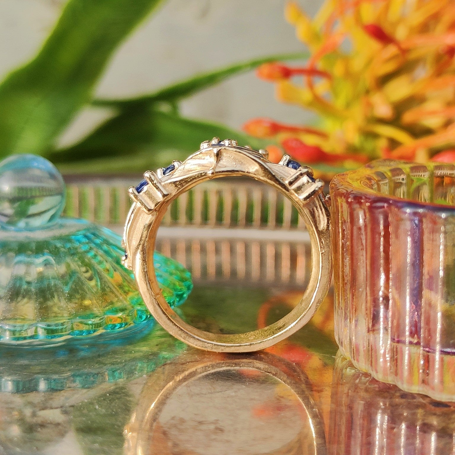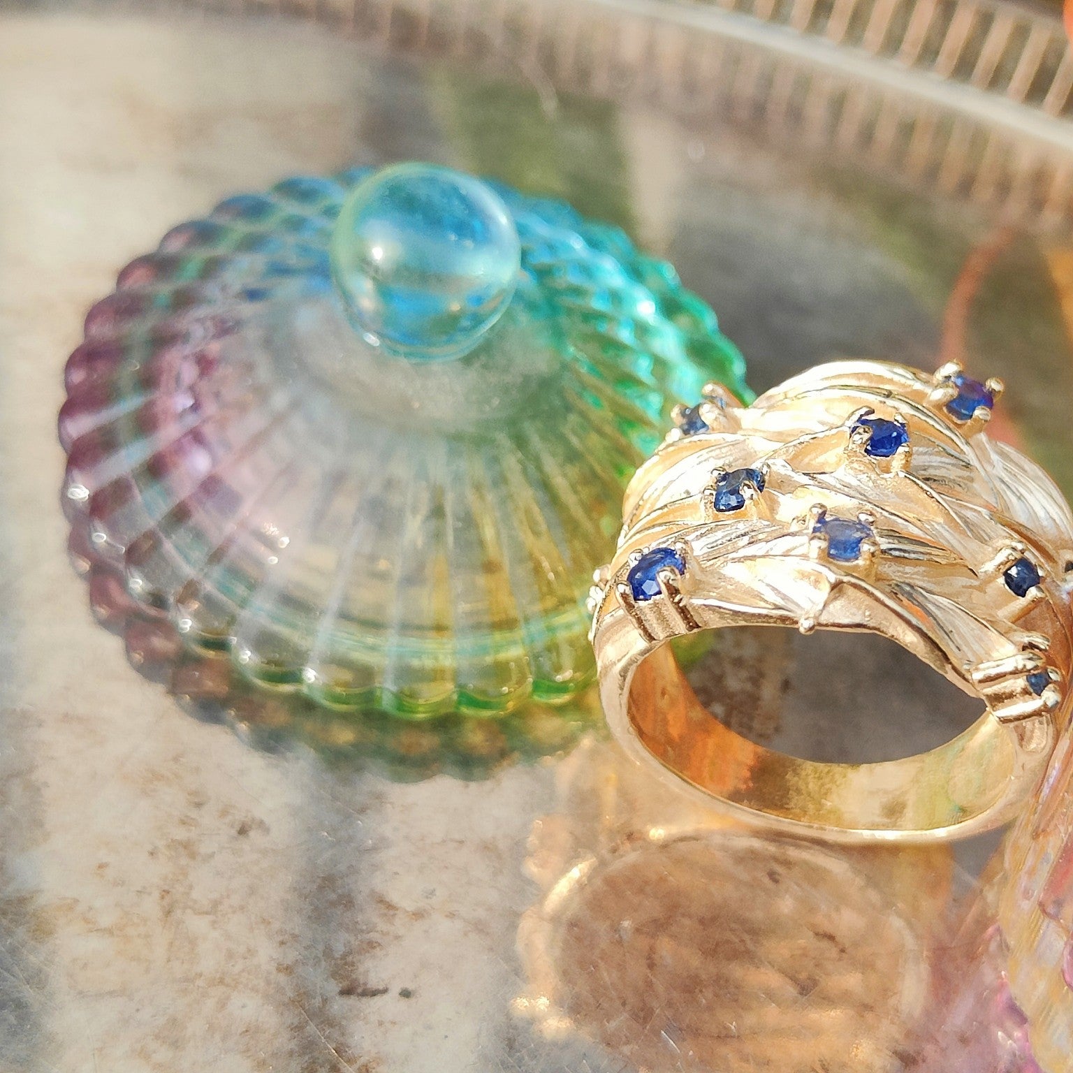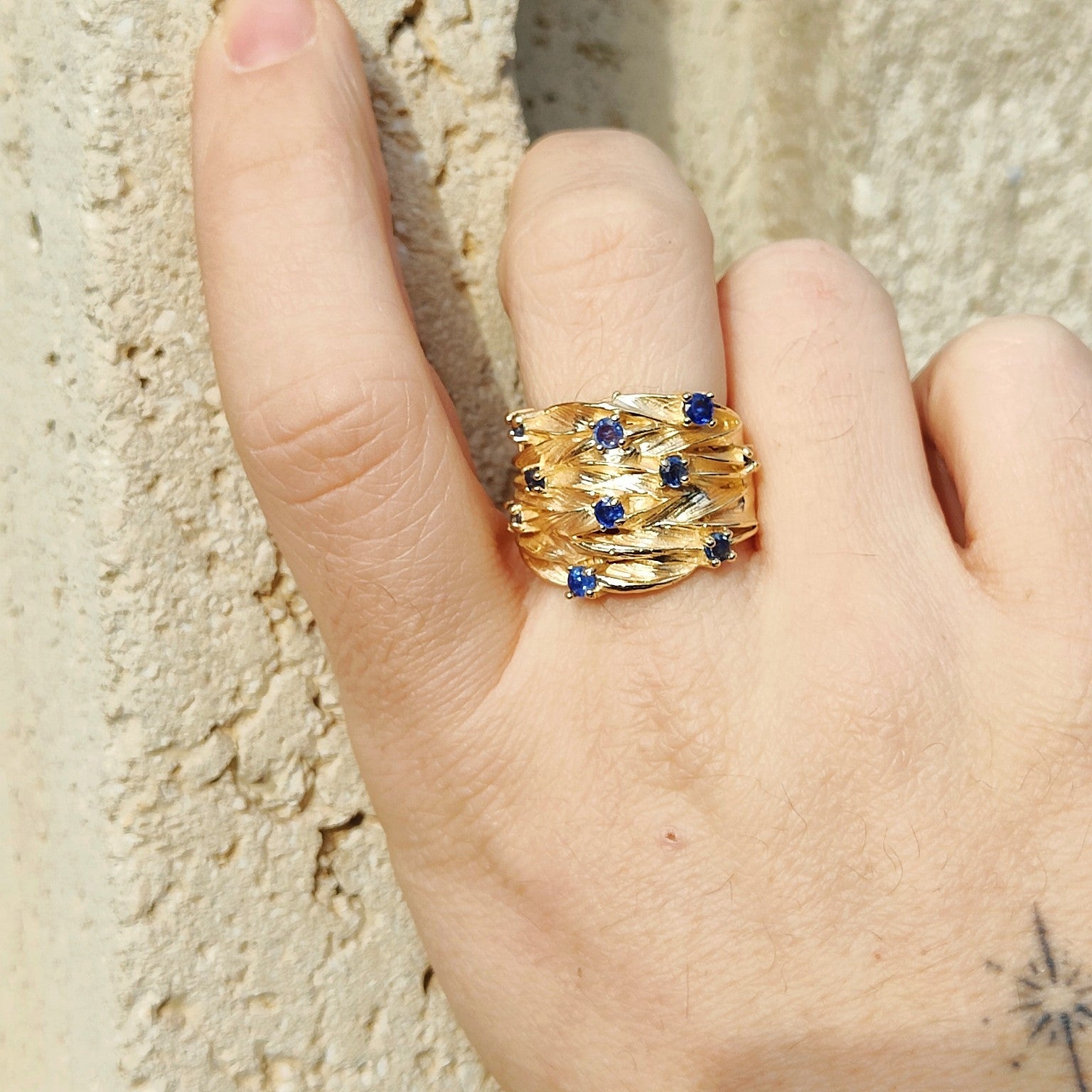 Anello in bronzo giallo placcato oro 3micron(*) con zaffiri naturali e blu.
