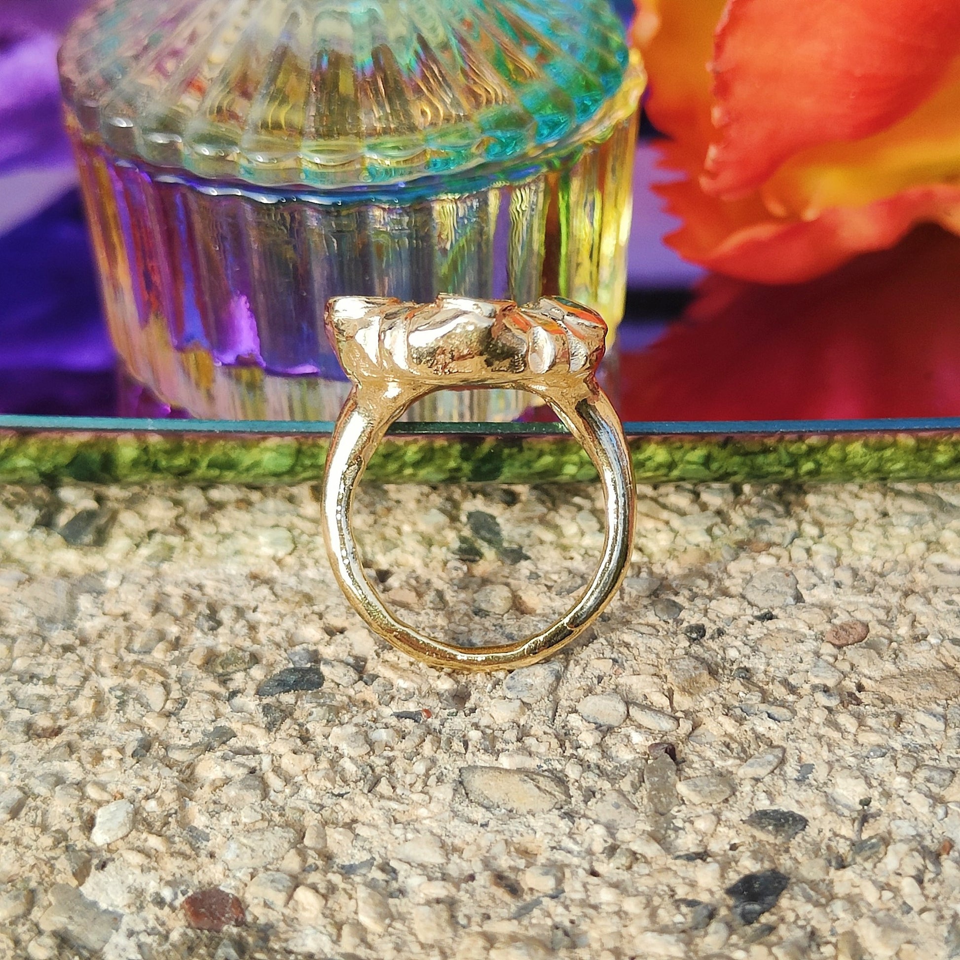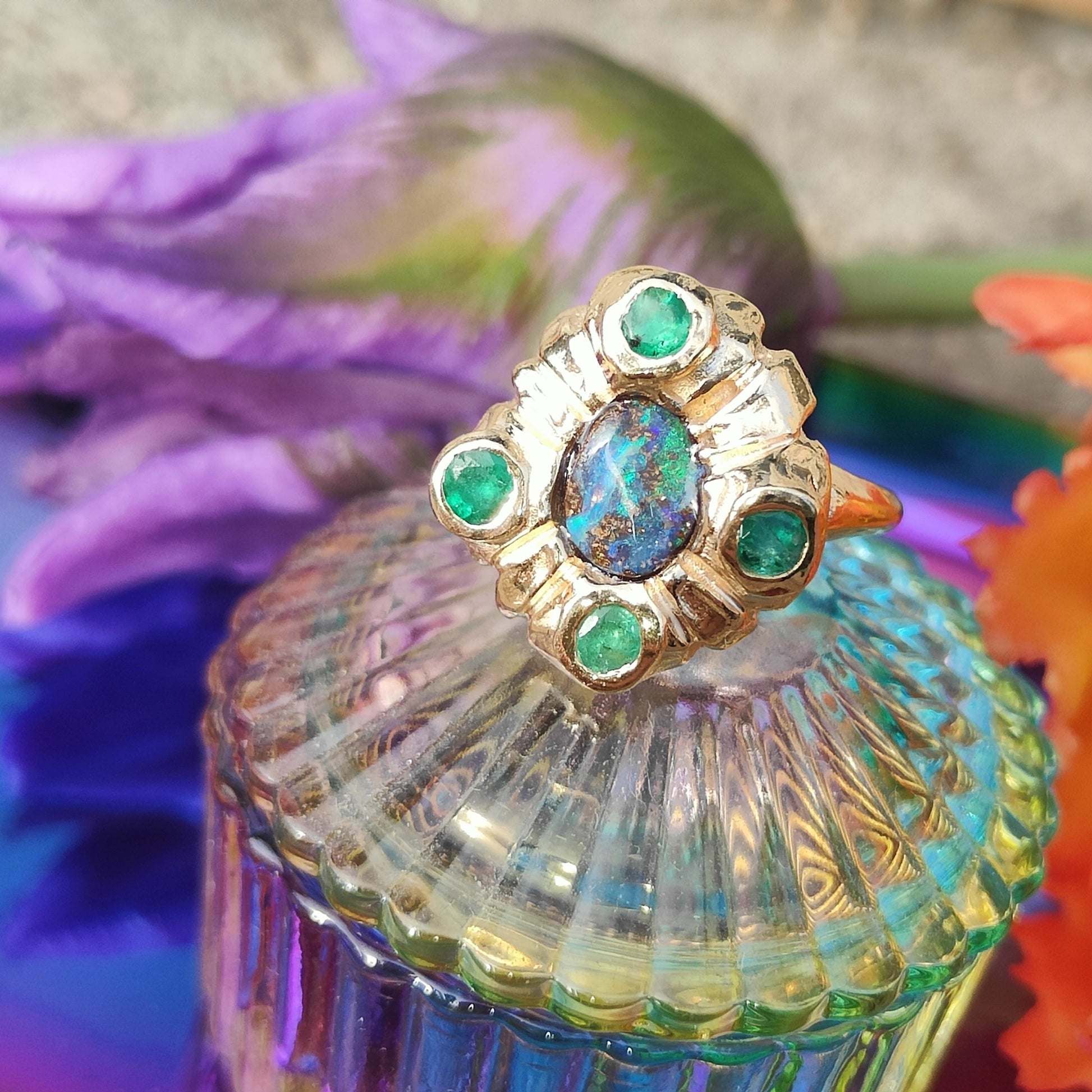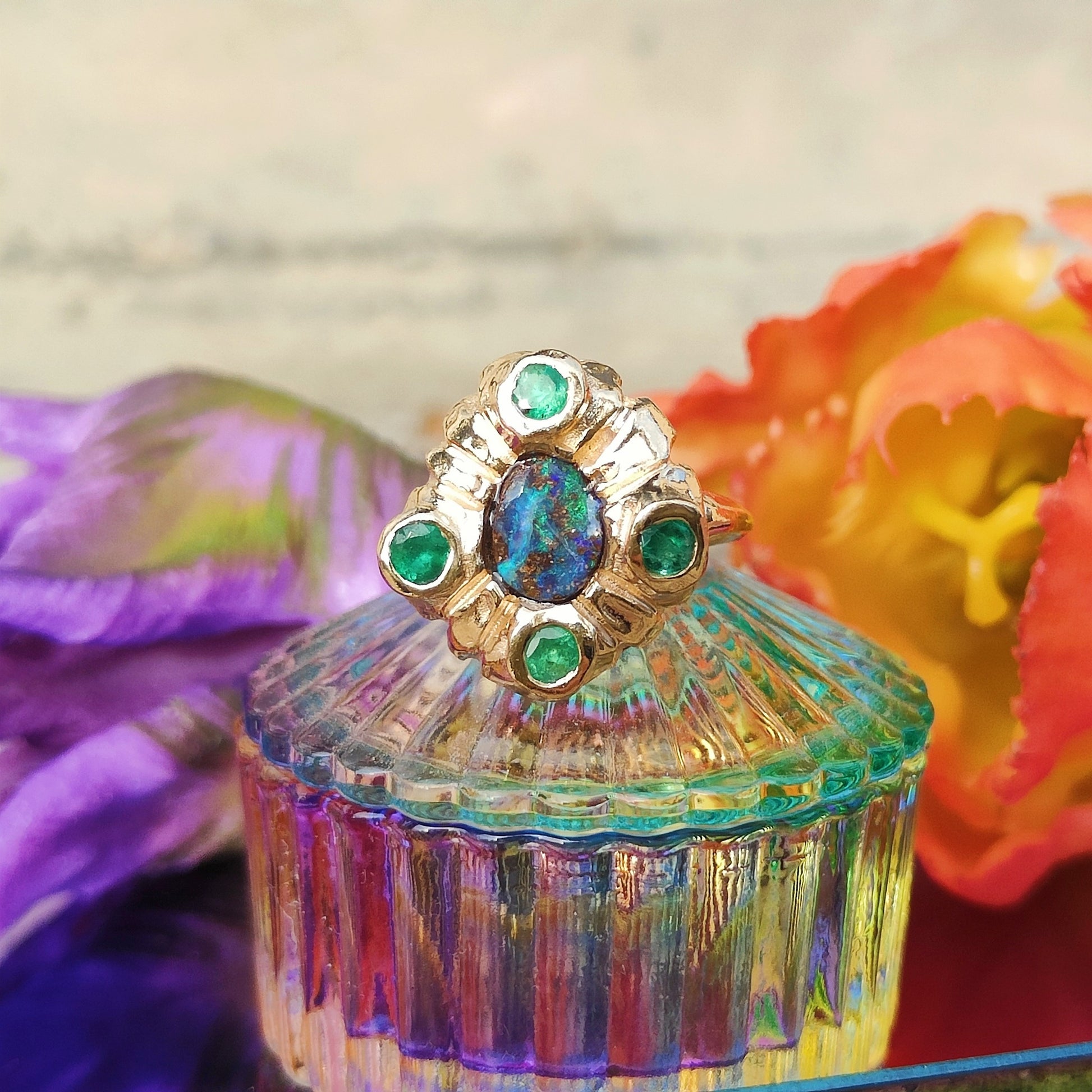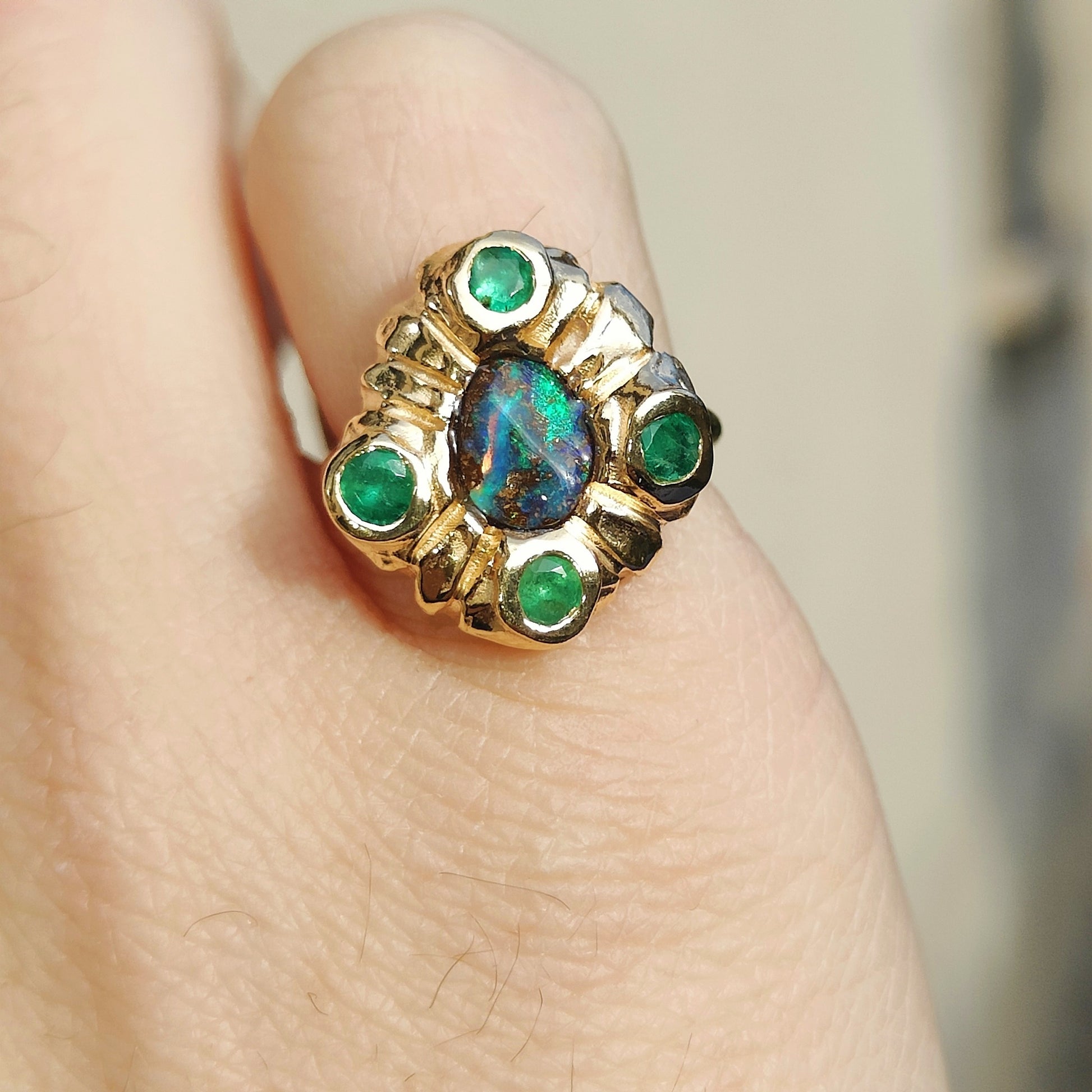 Anello in argento placcato oro 3 micron(*) con un design unico. Al centro, un opale boulder australiano incastonato, dai riflessi bellissimi. Intorno, quattro smeraldi verdi intensi.