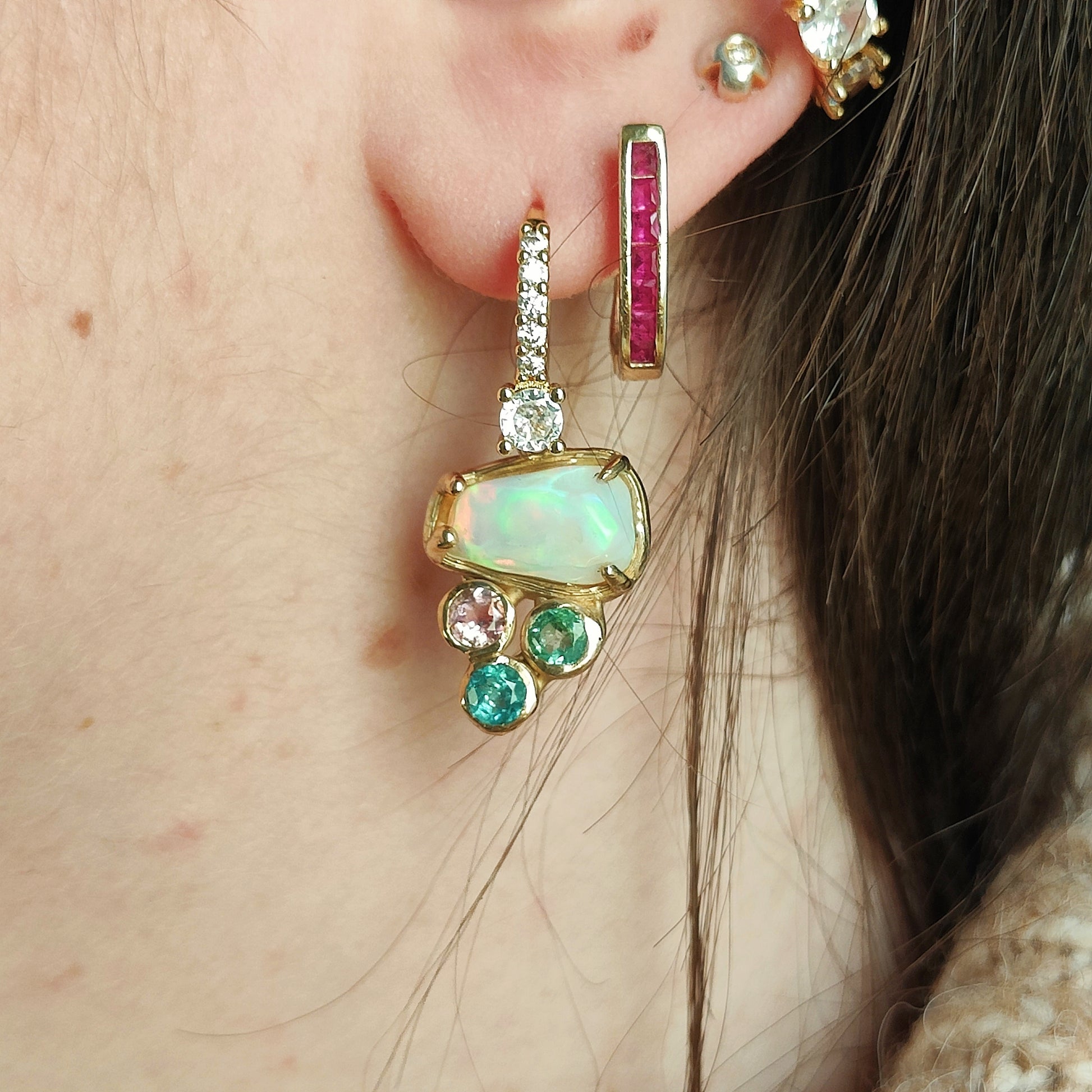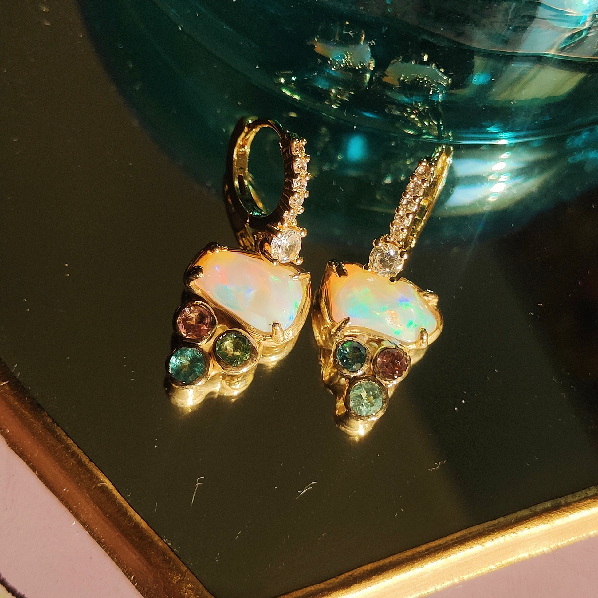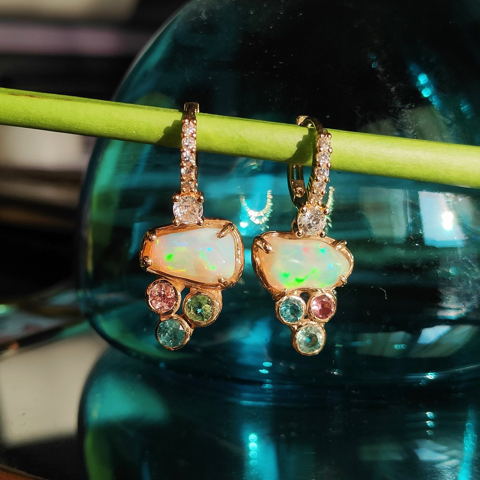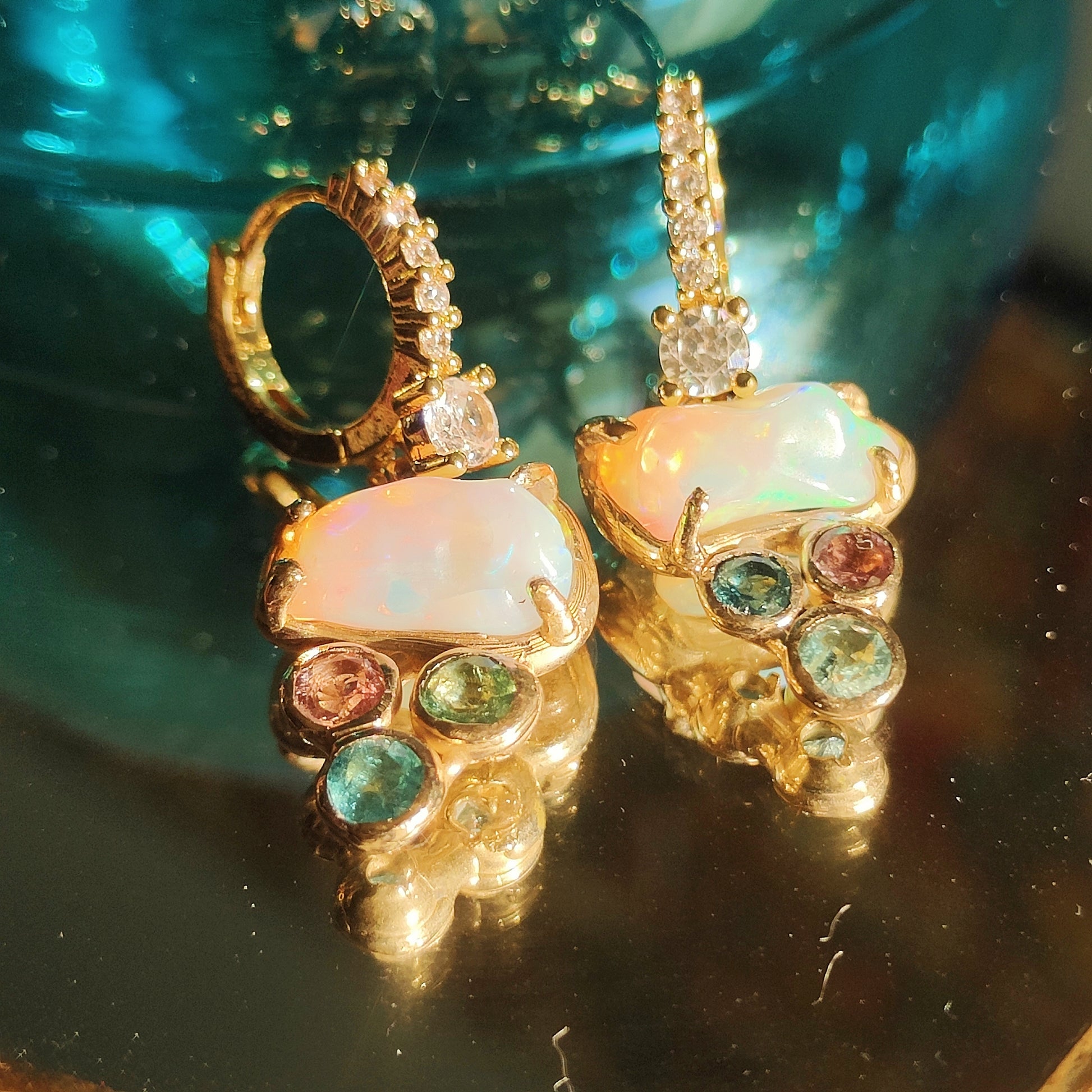 Una luce pazzesca, data dagli opali etiopi, le tormaline di diversi colori e le zirconia. Questi incantevoli orecchini, sono leggermente asimmetrici, ma proprio questo è il loro bello!