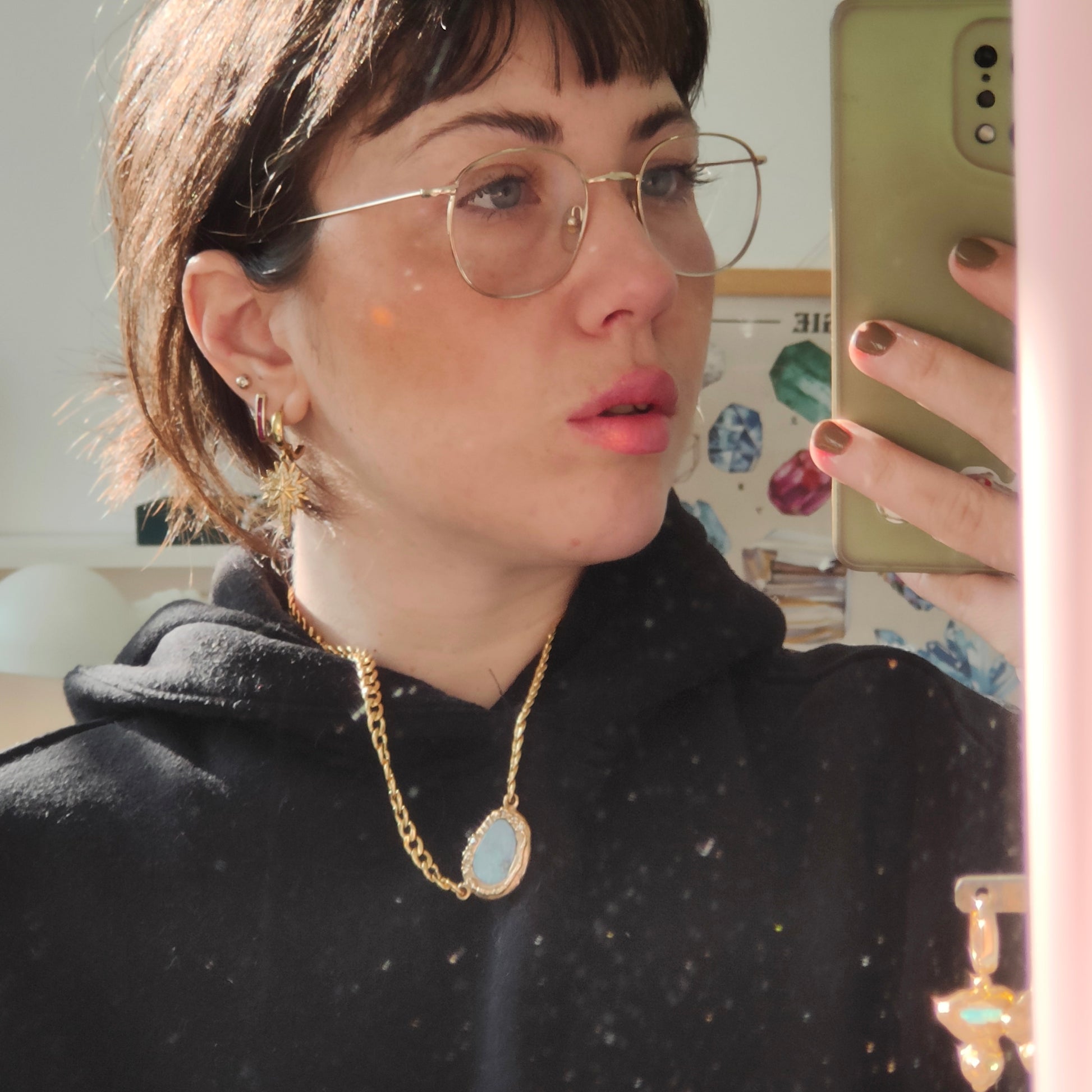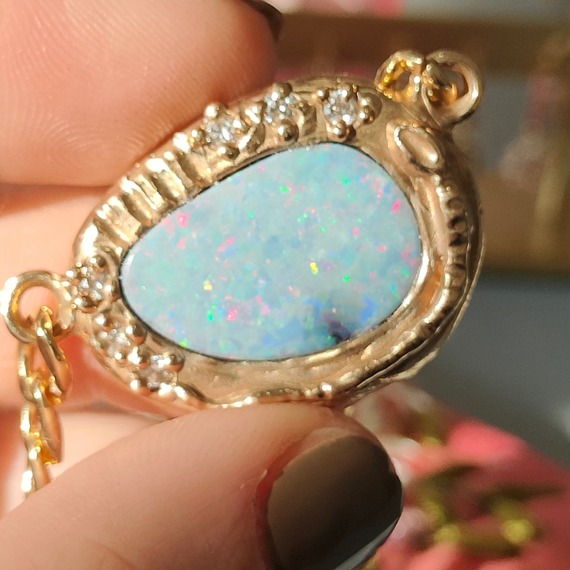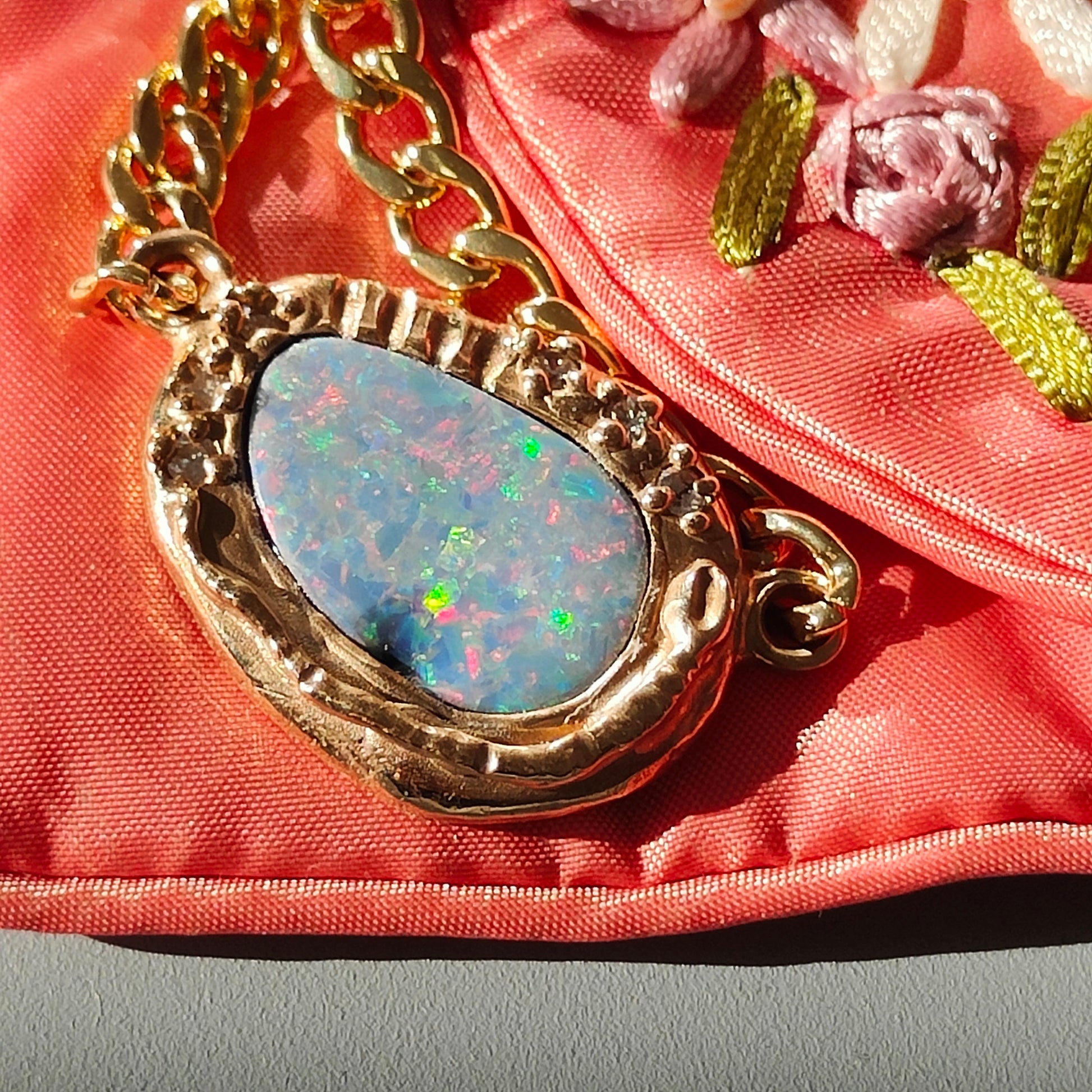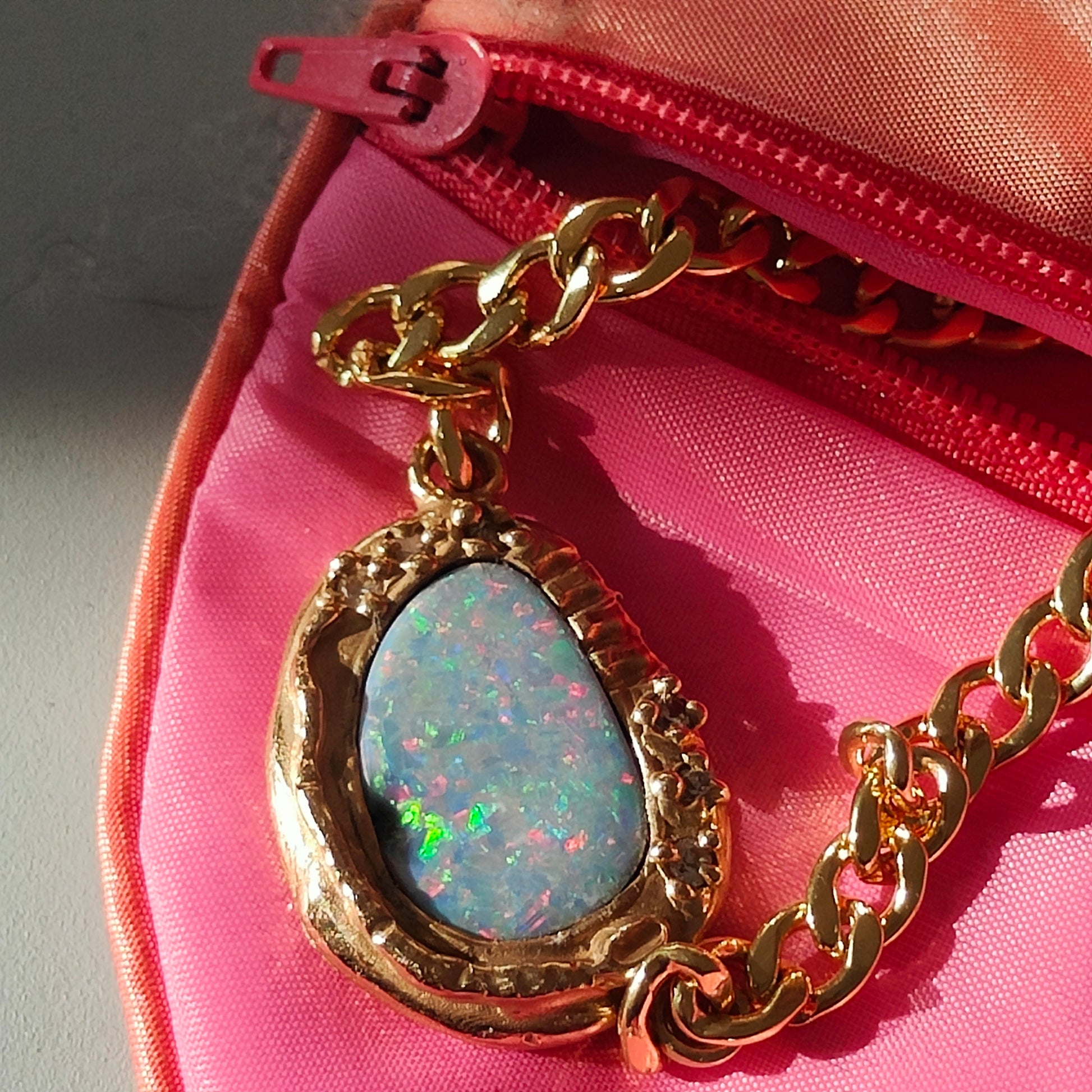 Collana con grossa catena groumette, molto rock! Il ciondolo è un bellissimo opale doppietta australiano che ha subito purtroppo un contraccolpo durante l' incassatura e dunque si è "sfogliato" lasciando un alone nero che sembra comunque parte della pietra. Un serpente e degli zirconi, circondano questa laguna di colori fluo!