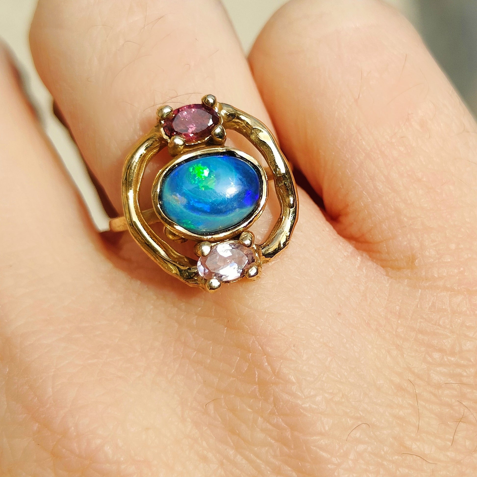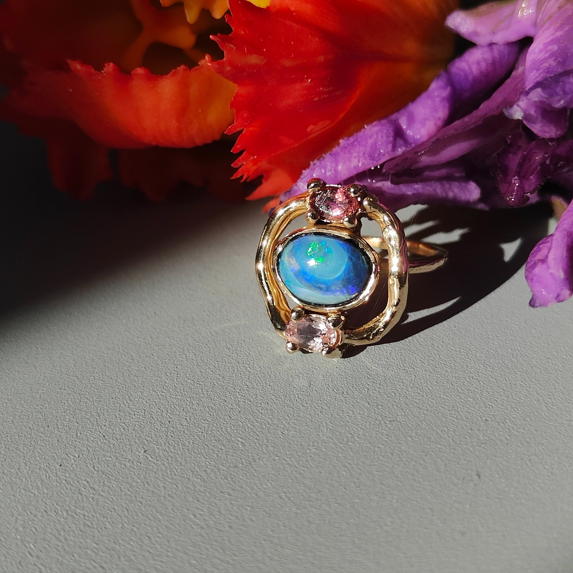 Anello con un opale centrale particolarissimo, di origine australiana, che ha dei disegni naturalmente concentrici e due tormaline rosa ovali di diverse tonalità .