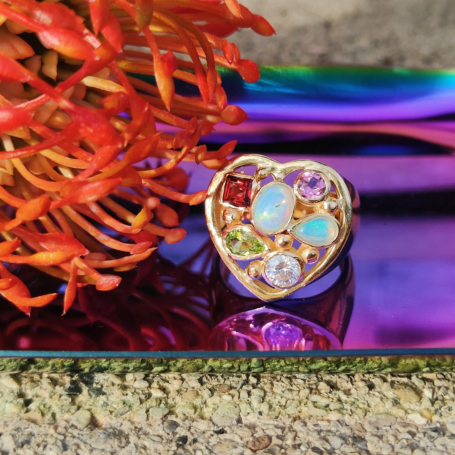 Anello in argento 925 placcato oro 3 micron(*) con opali, moissaniti, tormaline, peridoto.