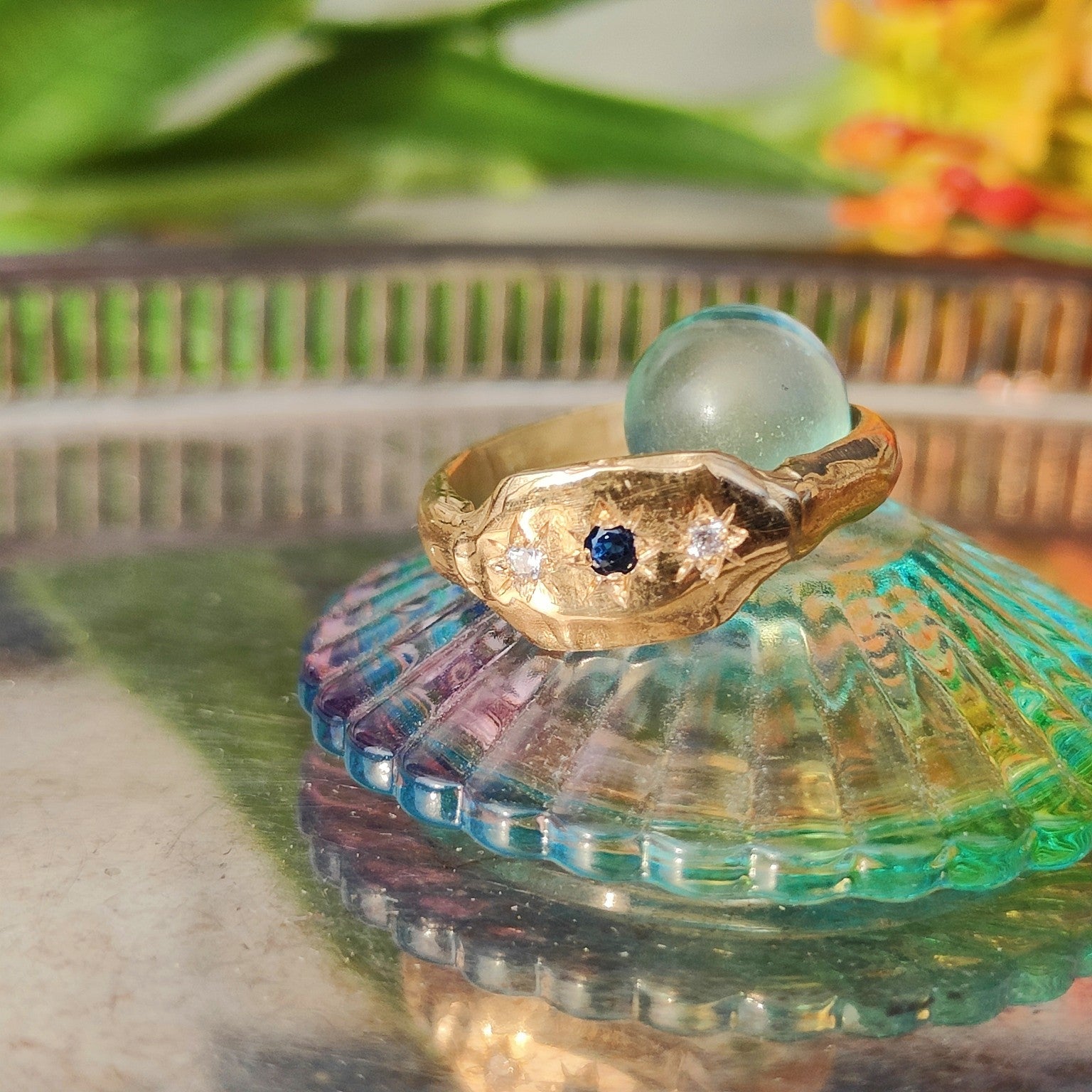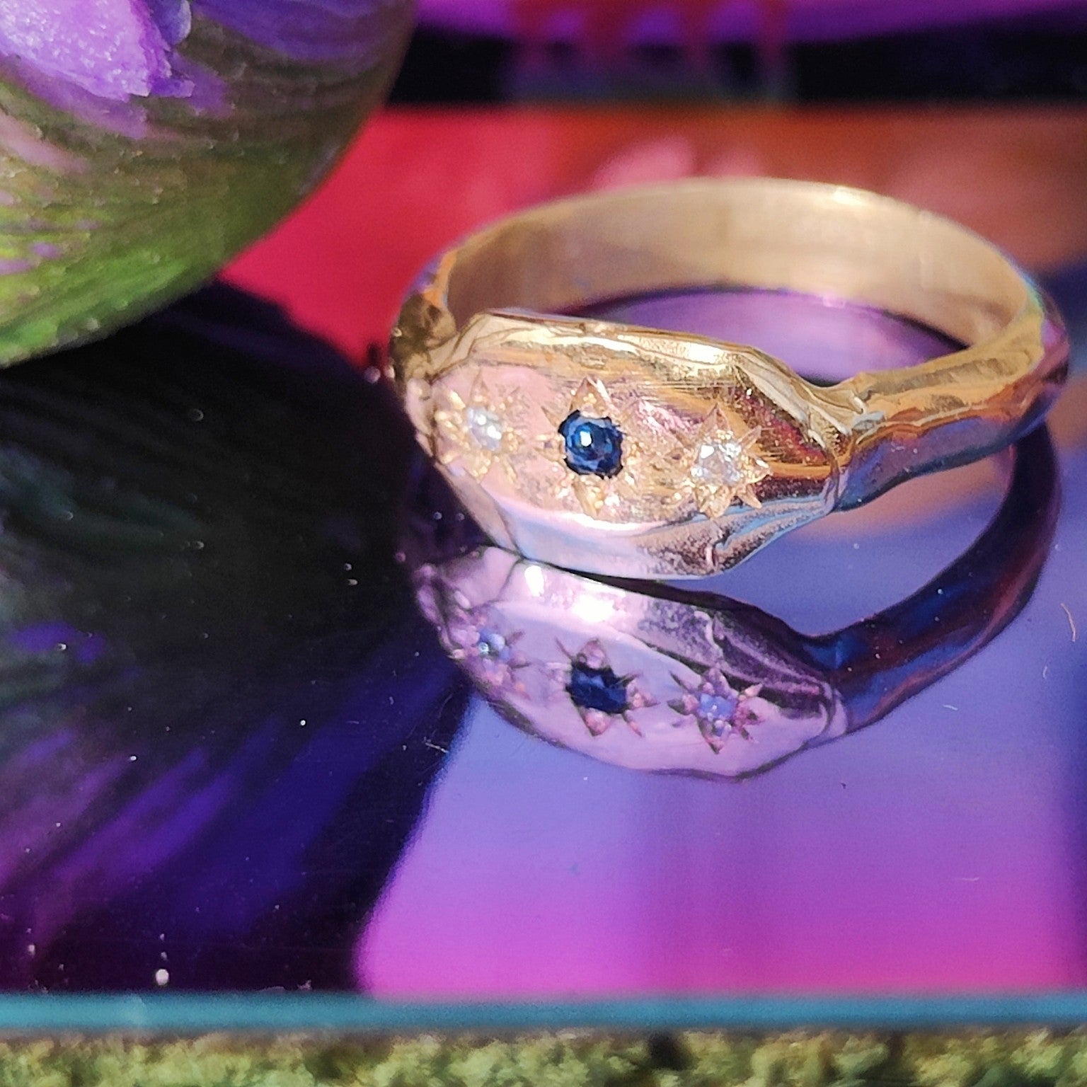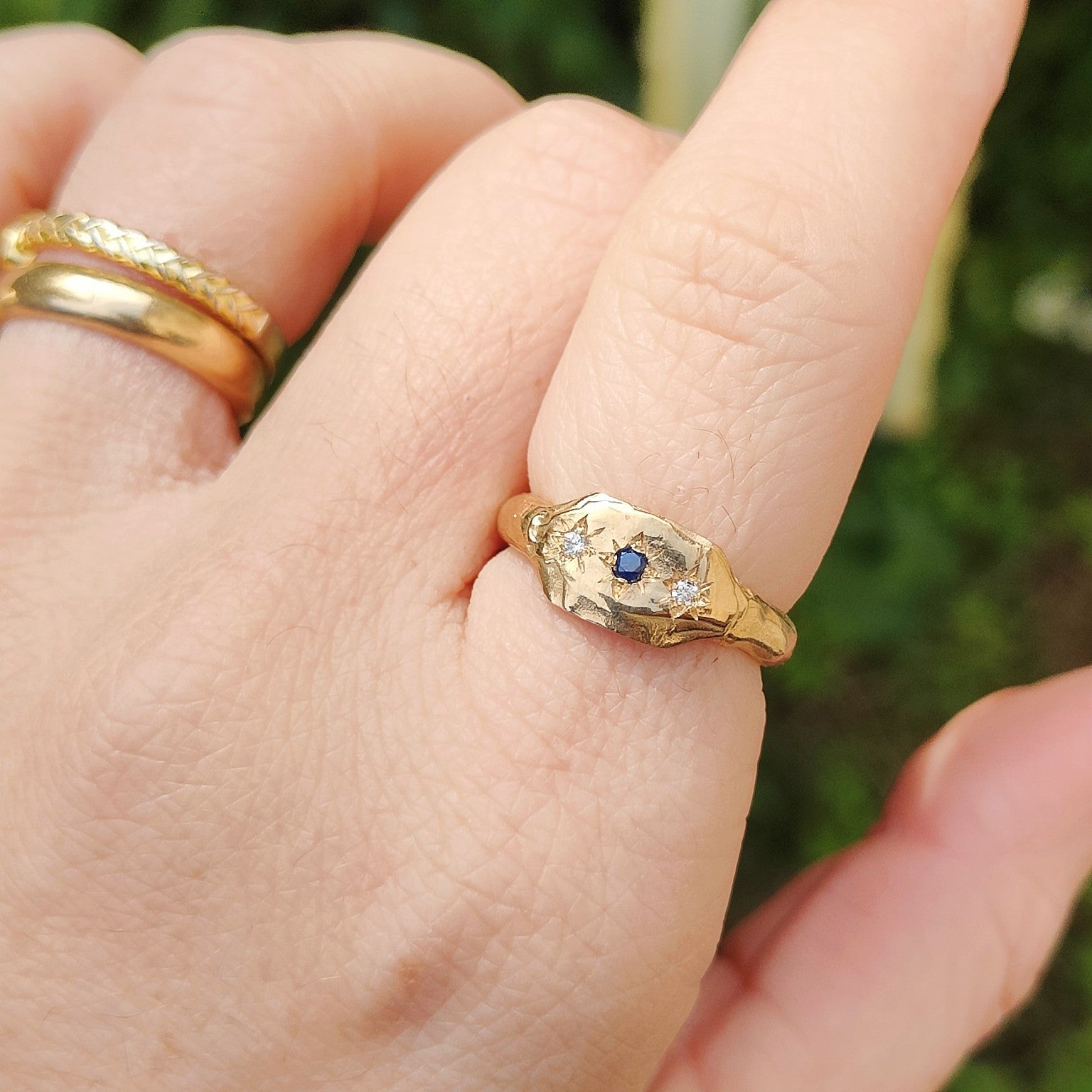 Anello in bronzo giallo, modello fedina ma dalla forma irregolare, con incastonati e incisi a stella, uno zaffiro centrale e due zirconia