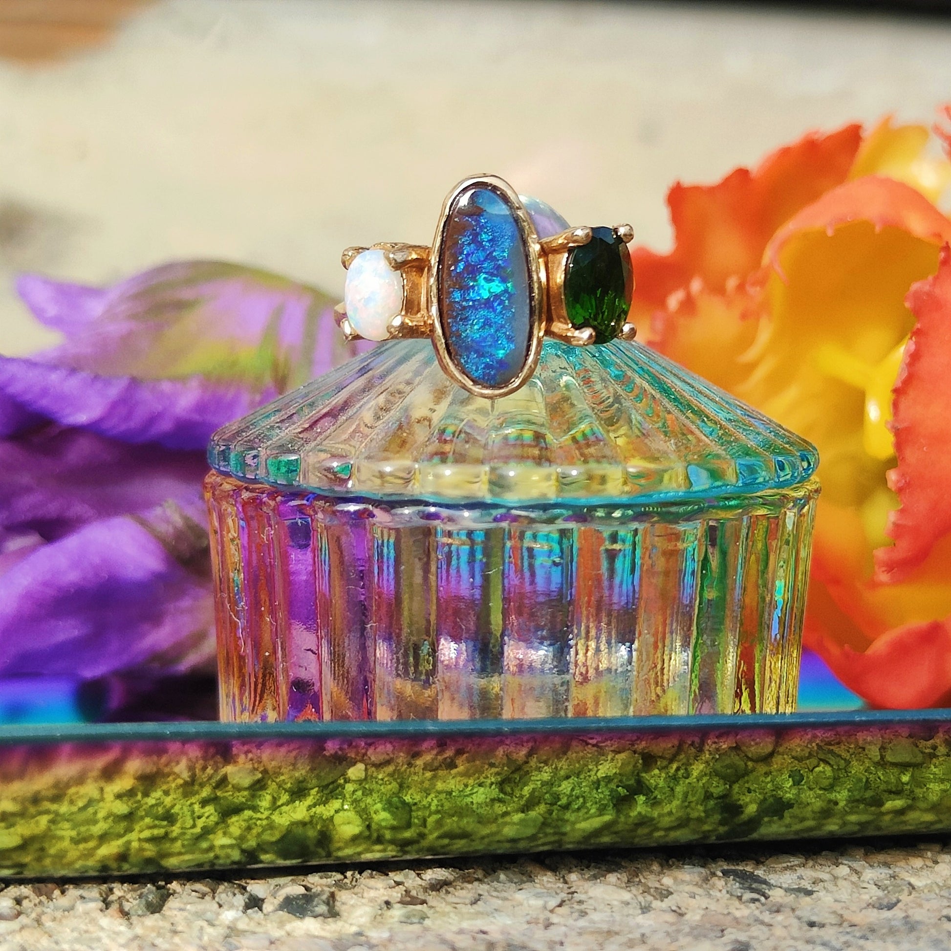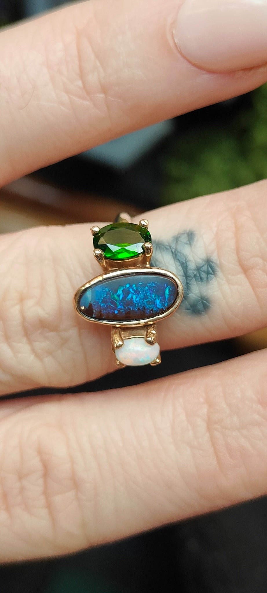 Anello elegante con tre pietre in combinazione. Al centro un opale boulder australiano, ai lati un cromodiopside e un opale australiano.