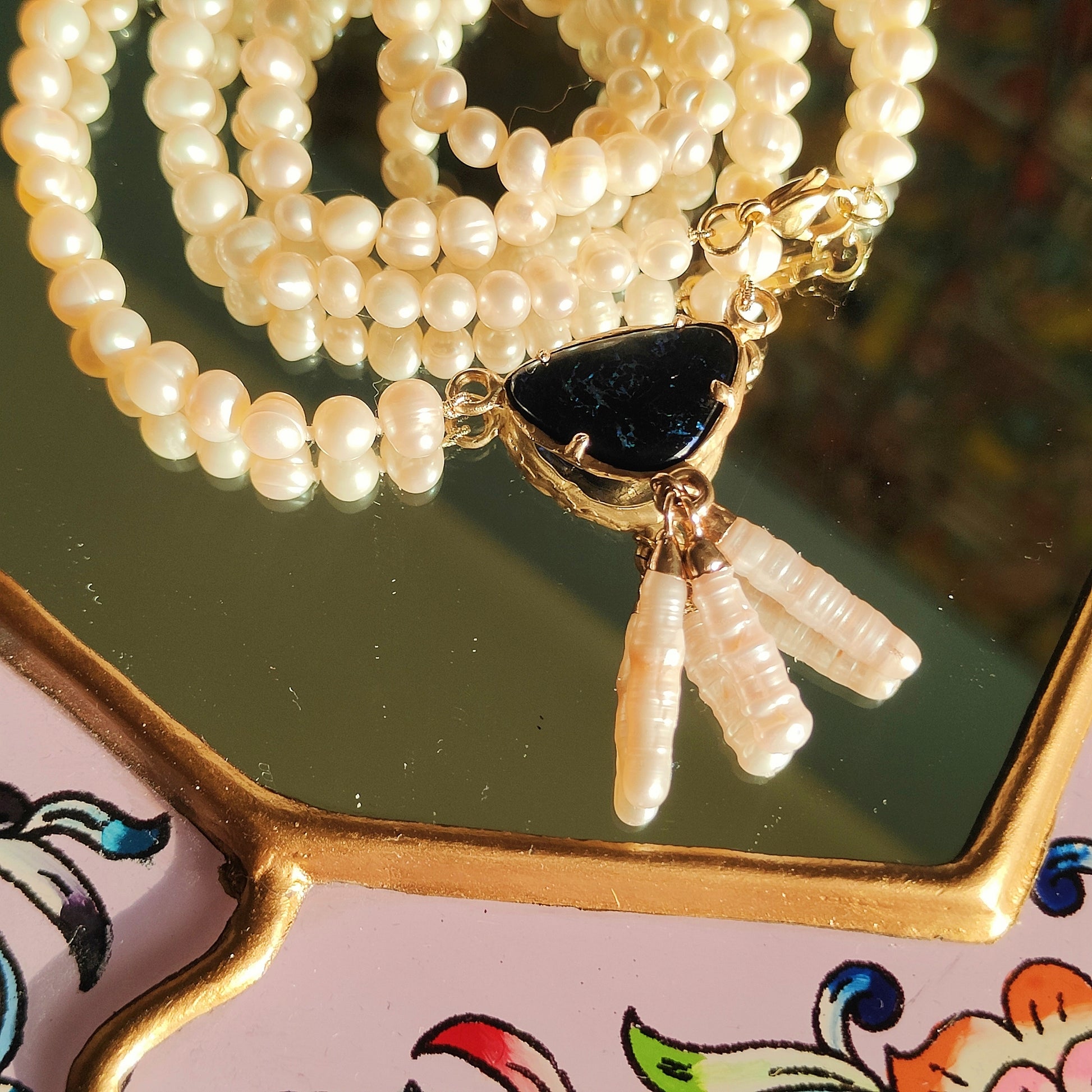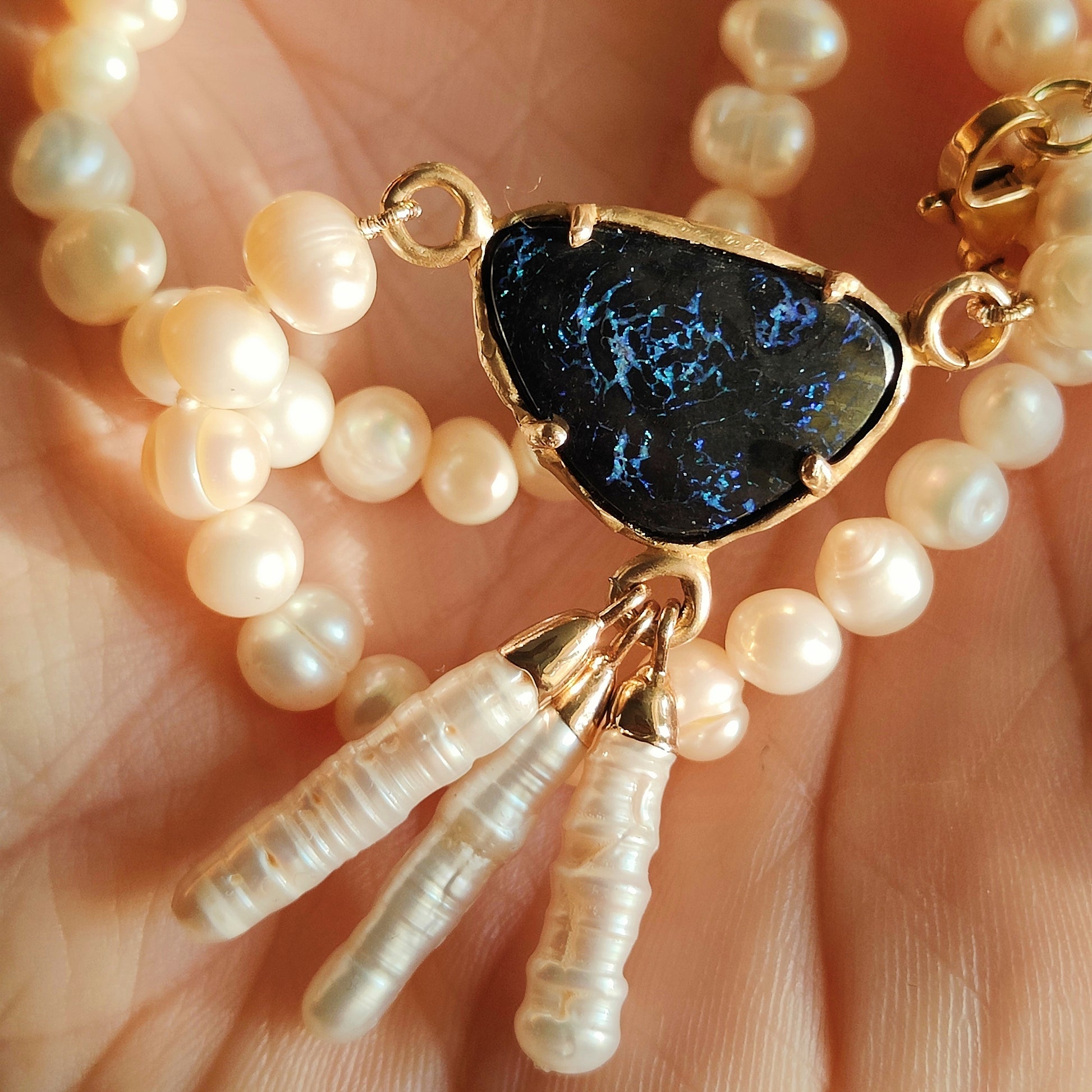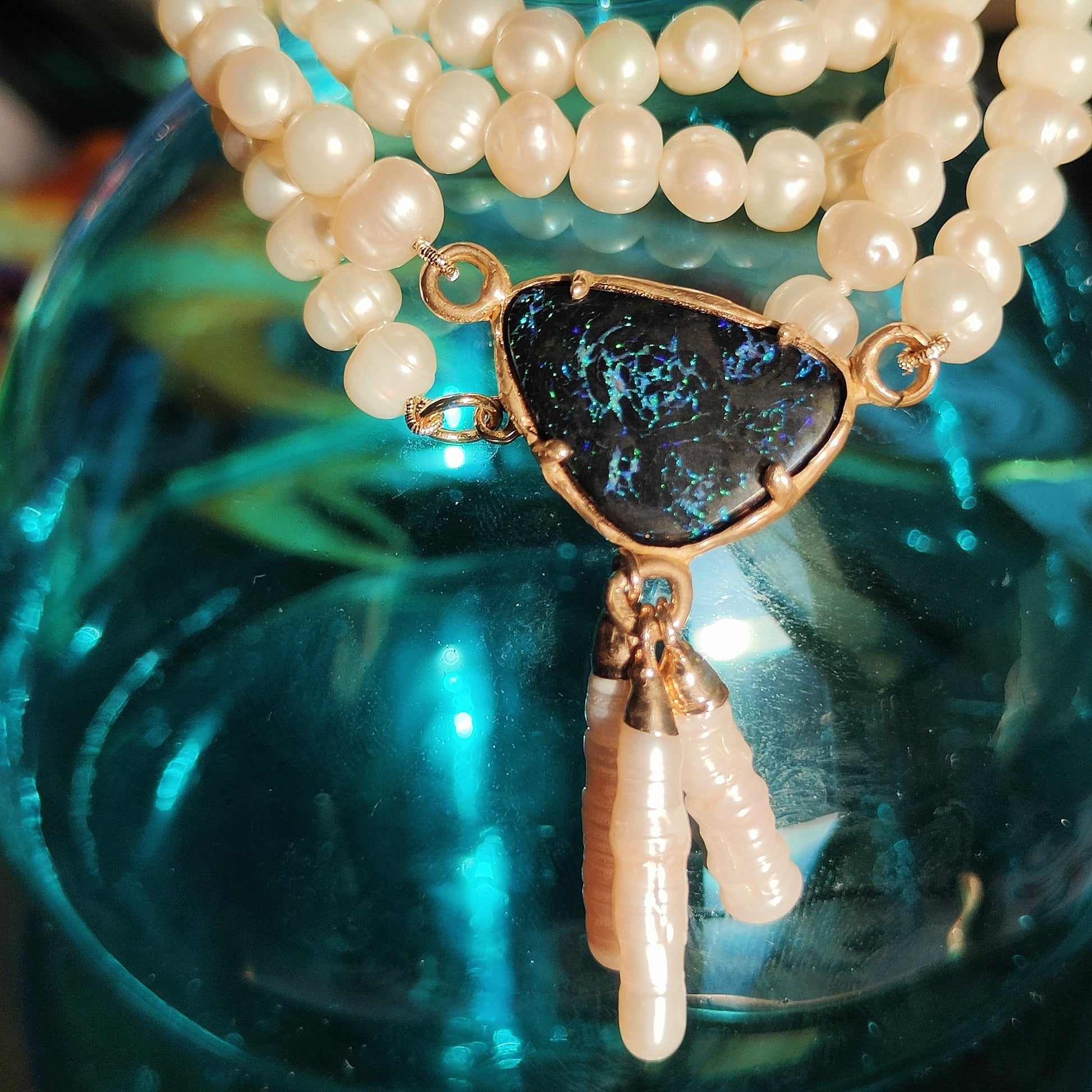 Collana lunga, di perle naturali, con bellissimo ciondolo centrale in bronzo giallo e opale boulder australiano nero con i riflessi blu.