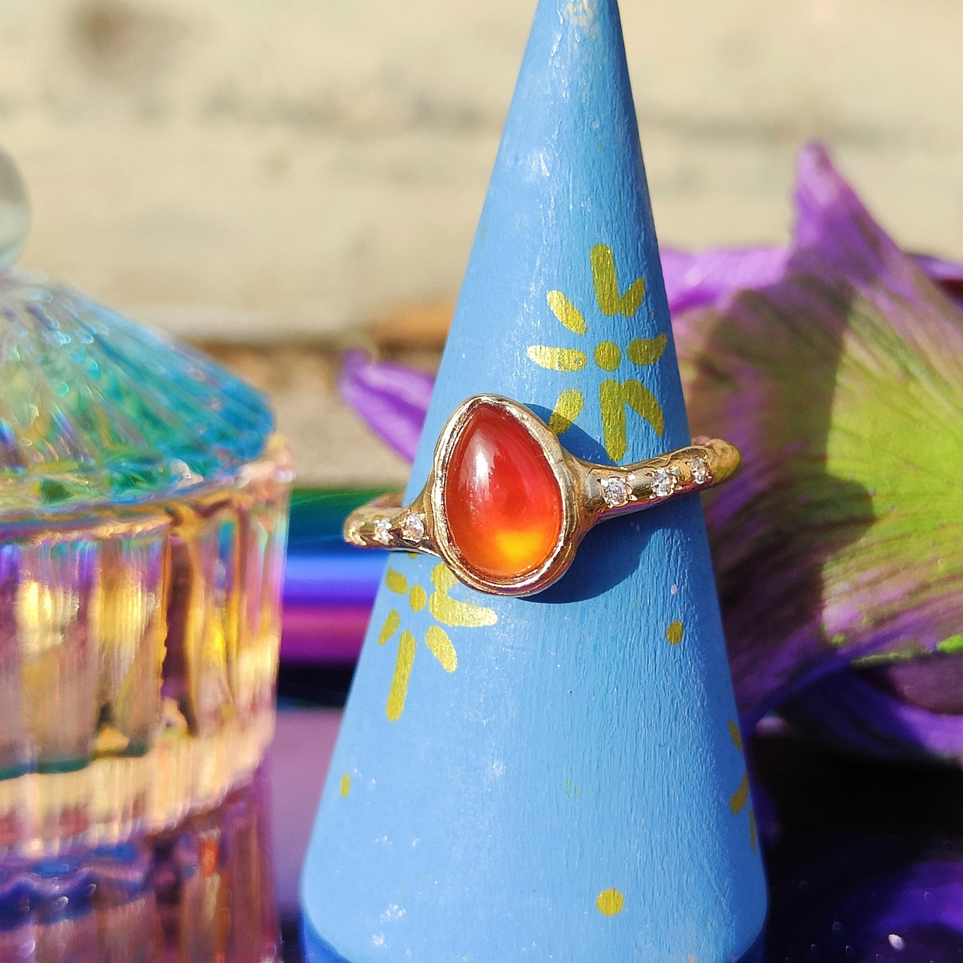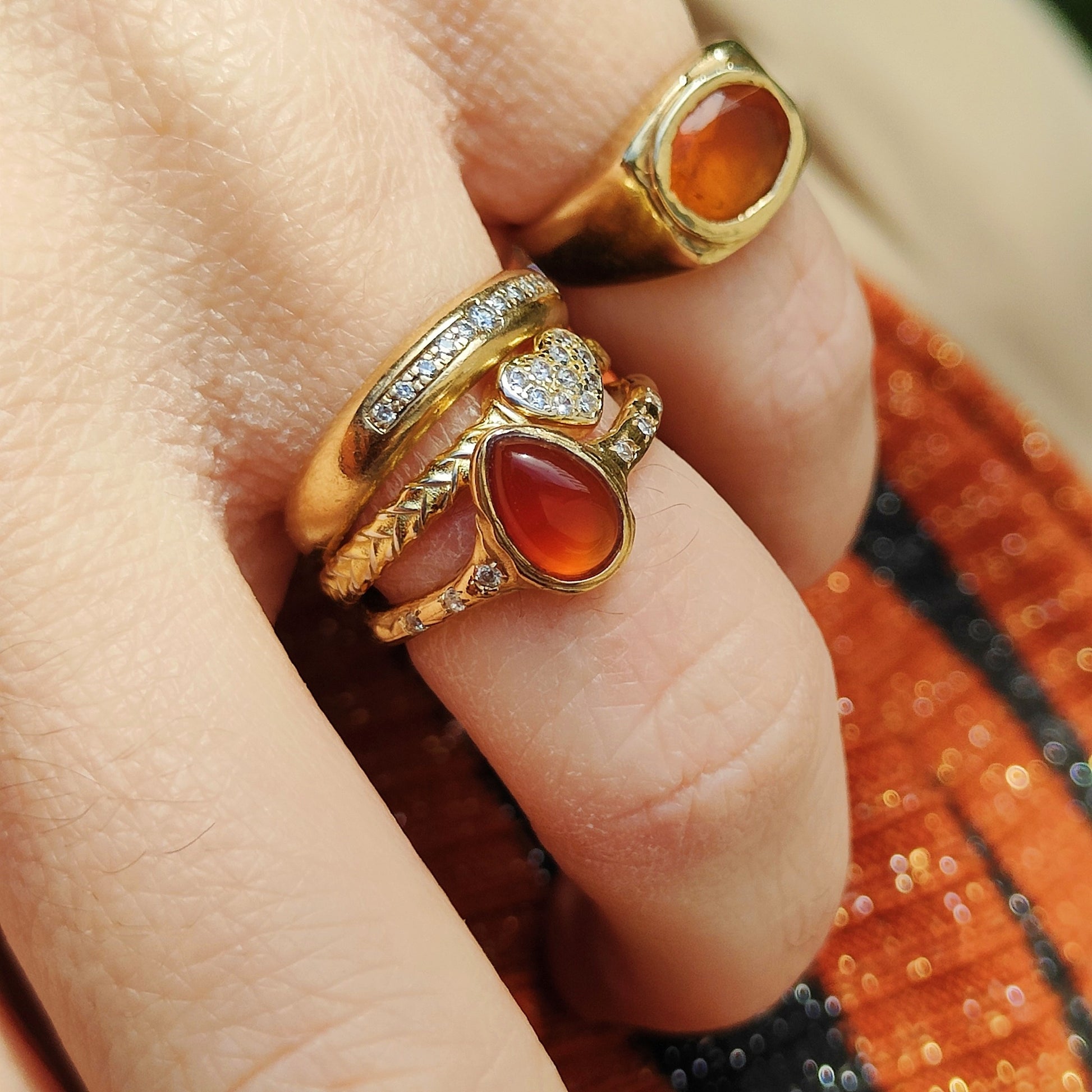 Anello bronzo giallo con corniola centrale a forma di goccia. I lati sono decorati con piccoli cubic zirconia.