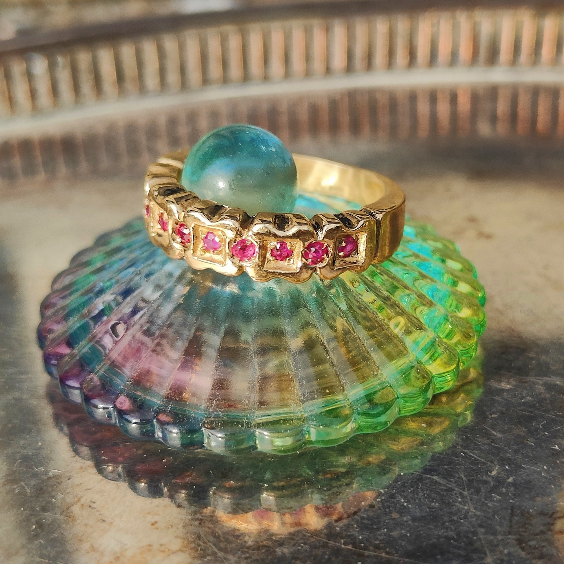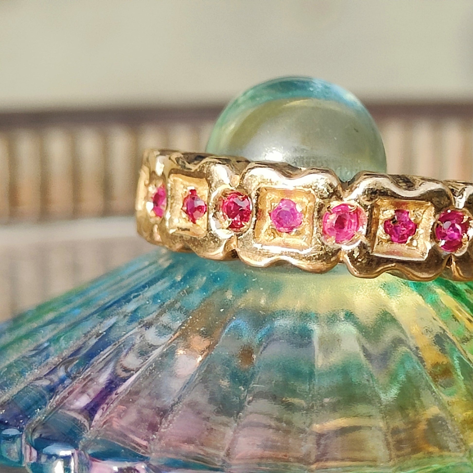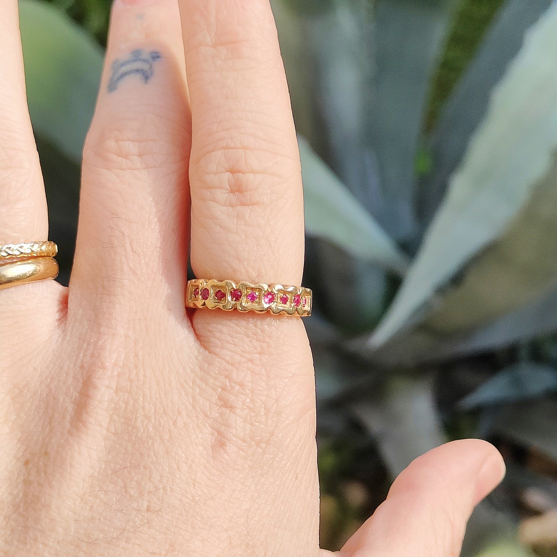 Anello classico e senza tempo in bronzo giallo con una fila di piccoli rubini incastonati.