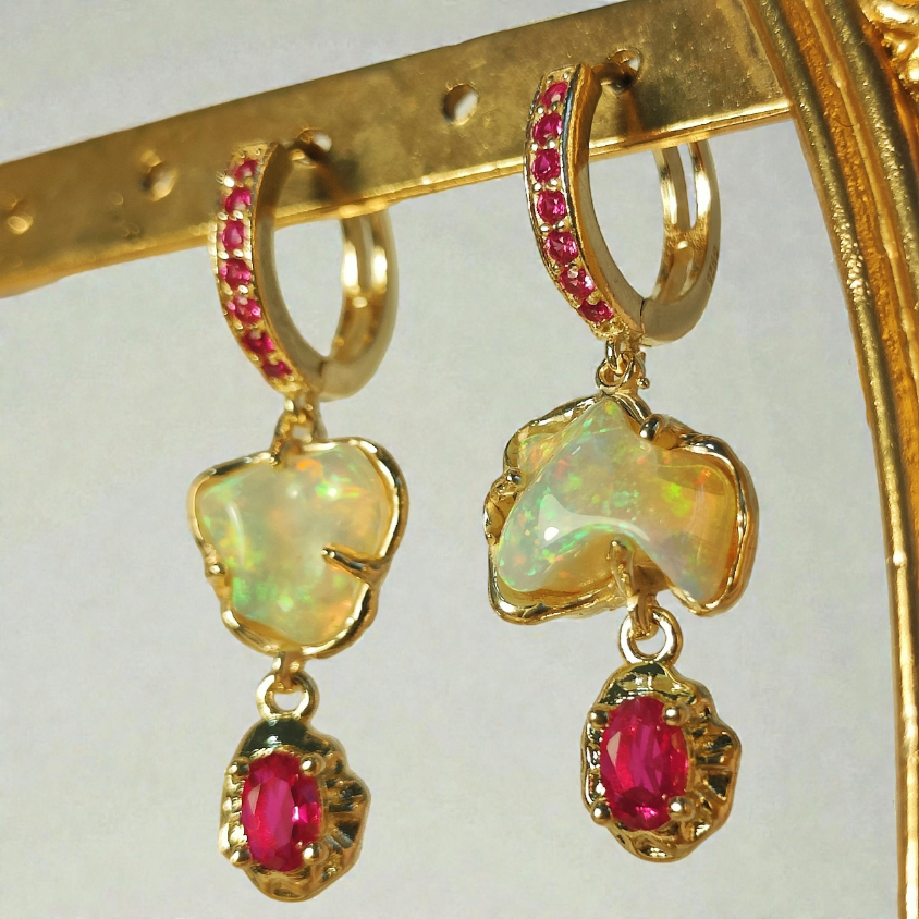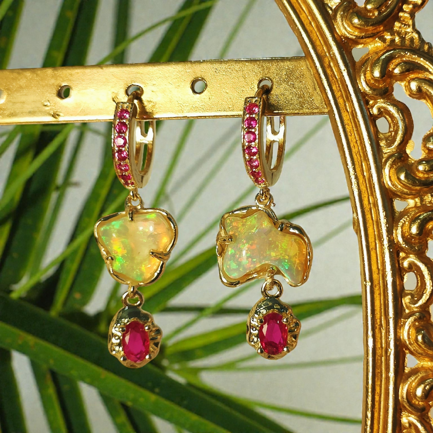 Questi orecchini sono tra i miei preferiti in assoluto! I cerchietti sono in argento placcato oro 3 micron così come tutto il resto dei pendenti e hanno incastonati degli zirconi rossi abbinati ai pendenti e in contrasto con i due magnifici opali etiopi dalla forma irregolare e asimmetrica!
