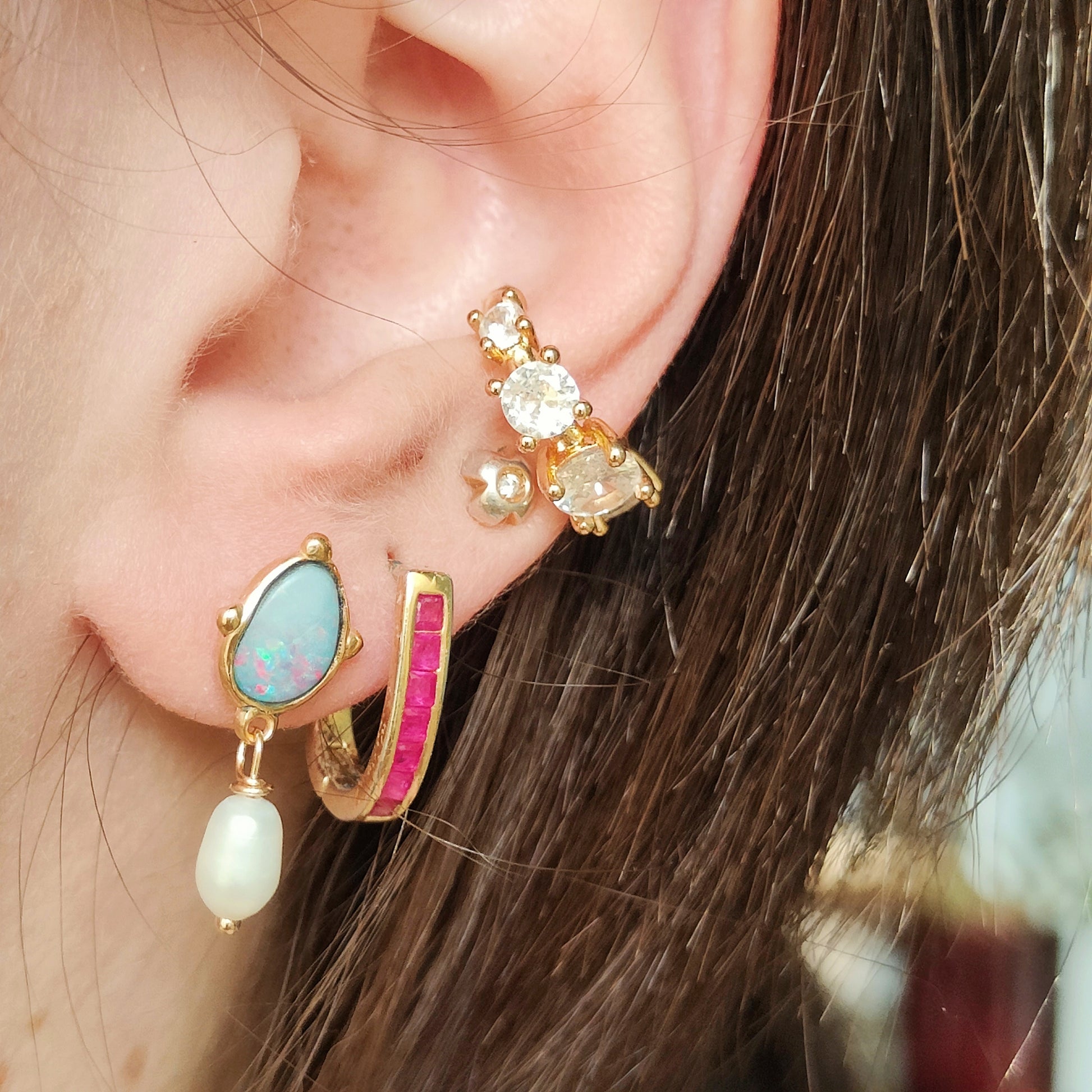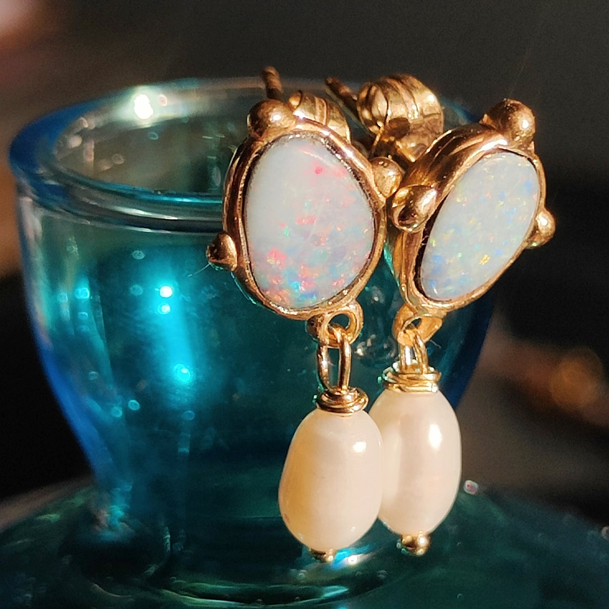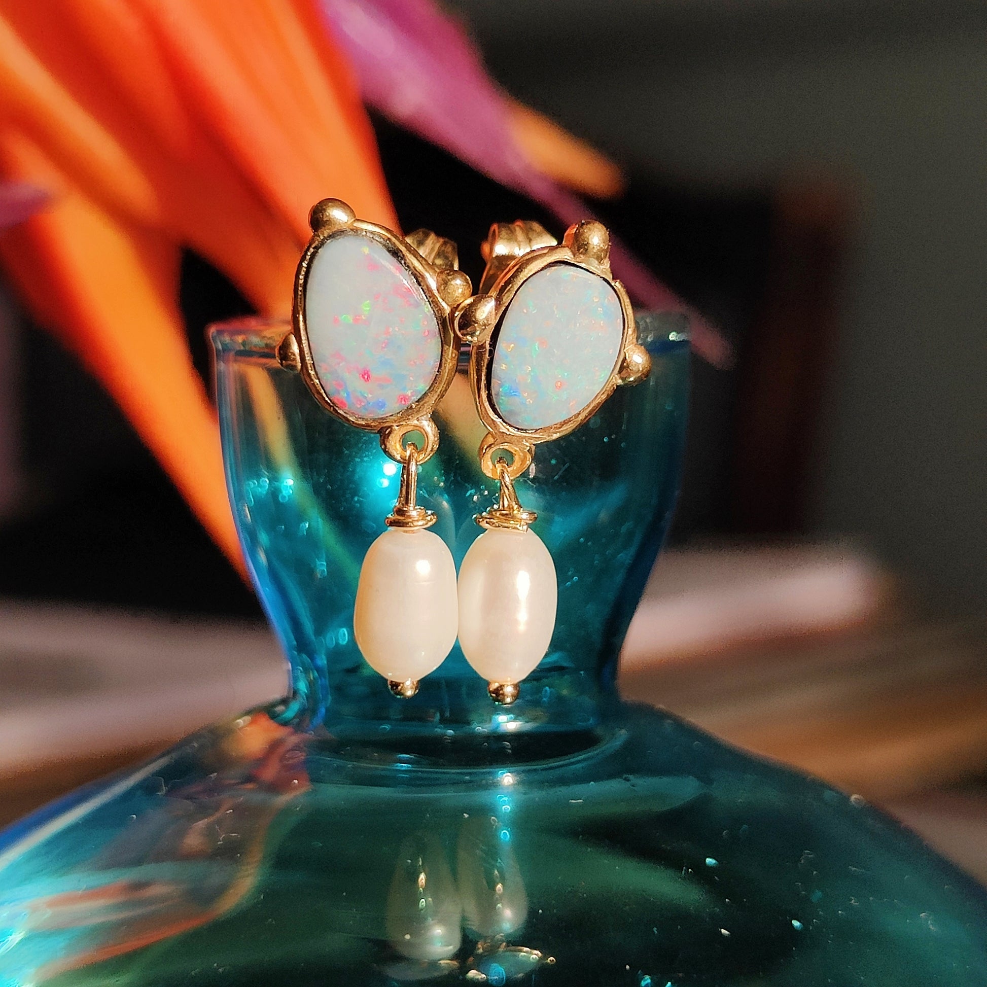 Questi splendori, che sono un pezzo unico, sono composti da due doppiette di opale boulder australiano e due bellissime perle naturali a goccia.