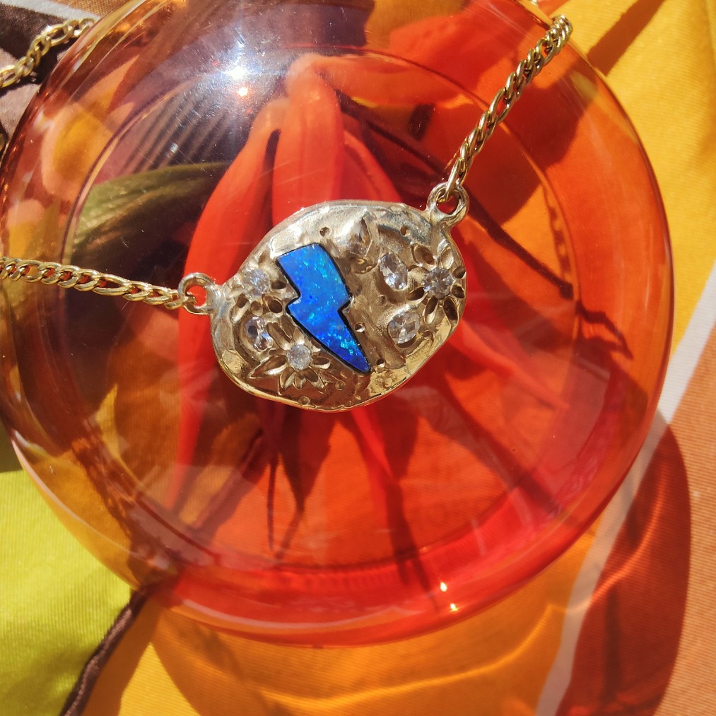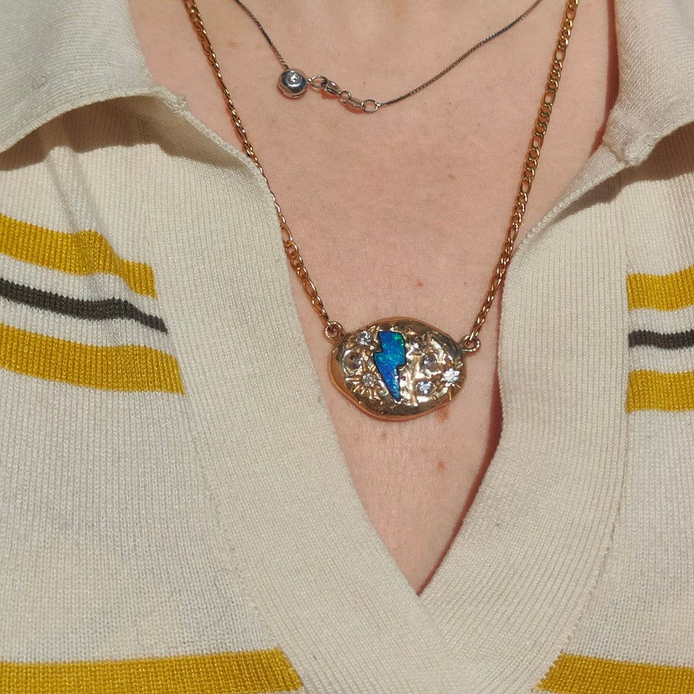 Bronzo giallo, catena in acciaio dorato, doppietta di opale australiano e zirconia.