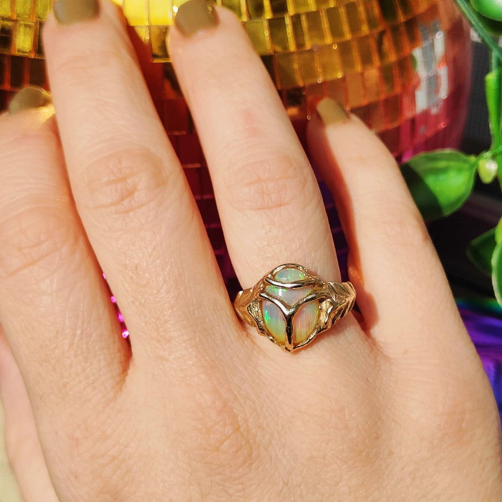 Questo anello è speciale, non solo per la pietra, un bellissimo opale etiope intarsiato a forma di scarabeo, ma anche per la complessità della realizzazione. Lo scarabeo è infatti inglobato in un'armatura dorata, in bronzo giallo, che lo protegge.