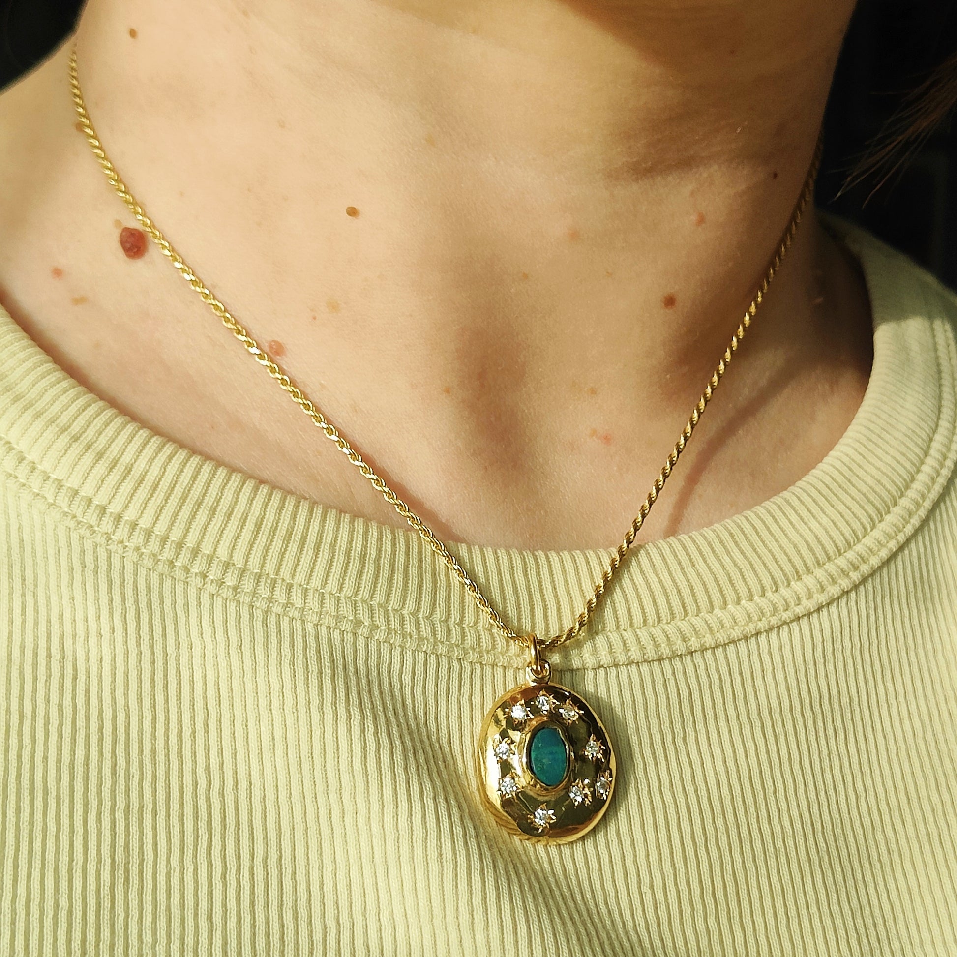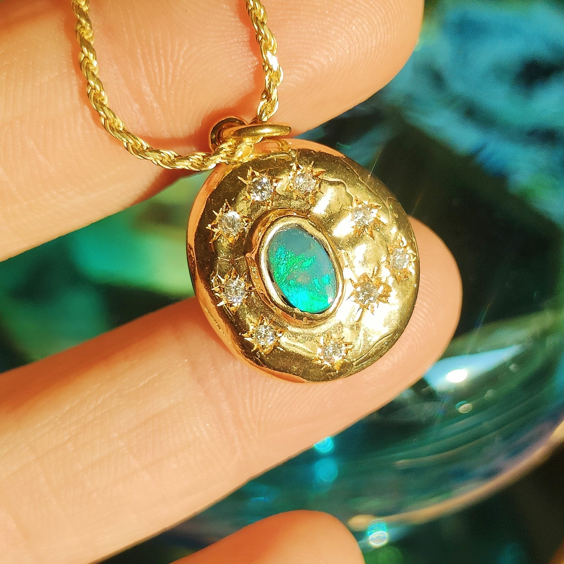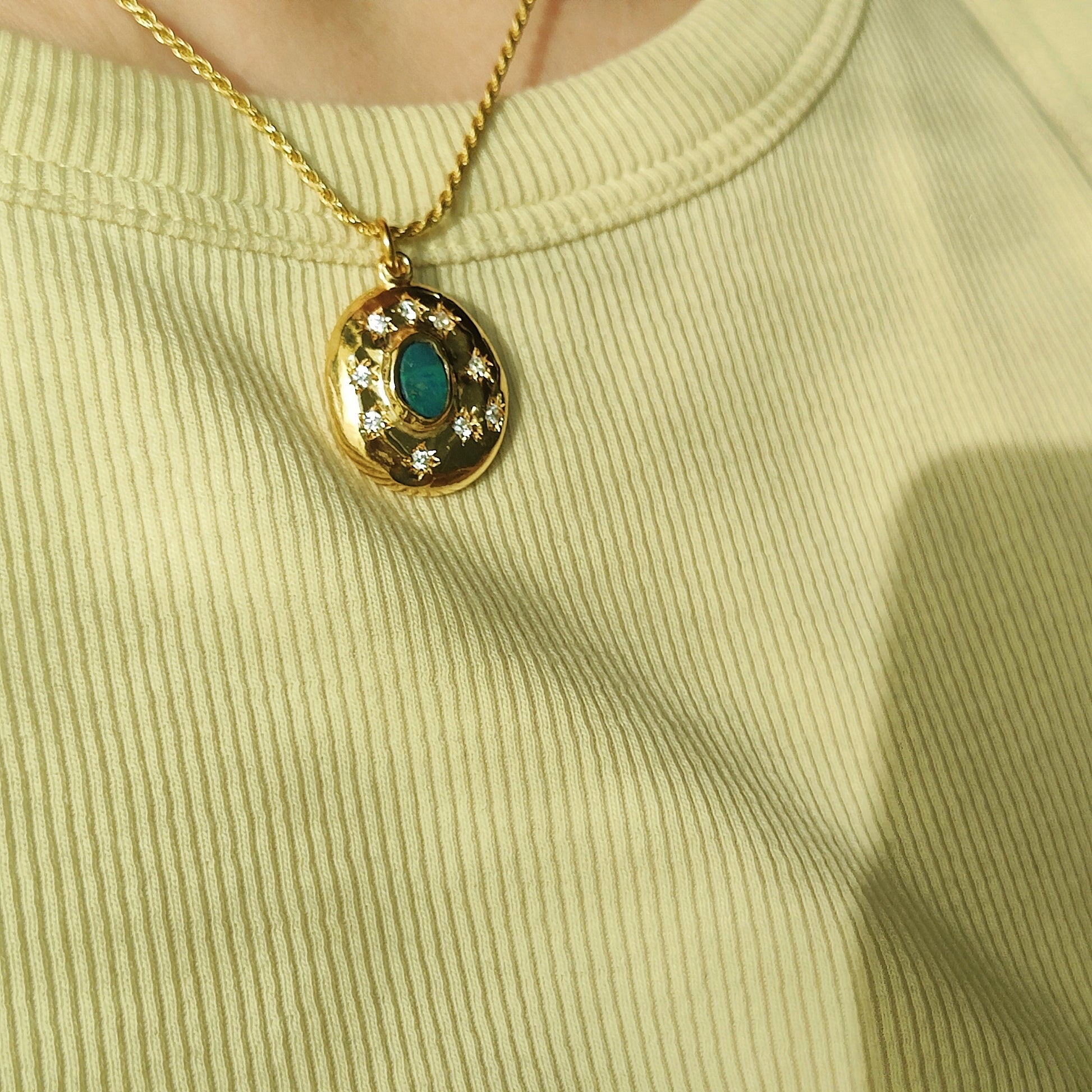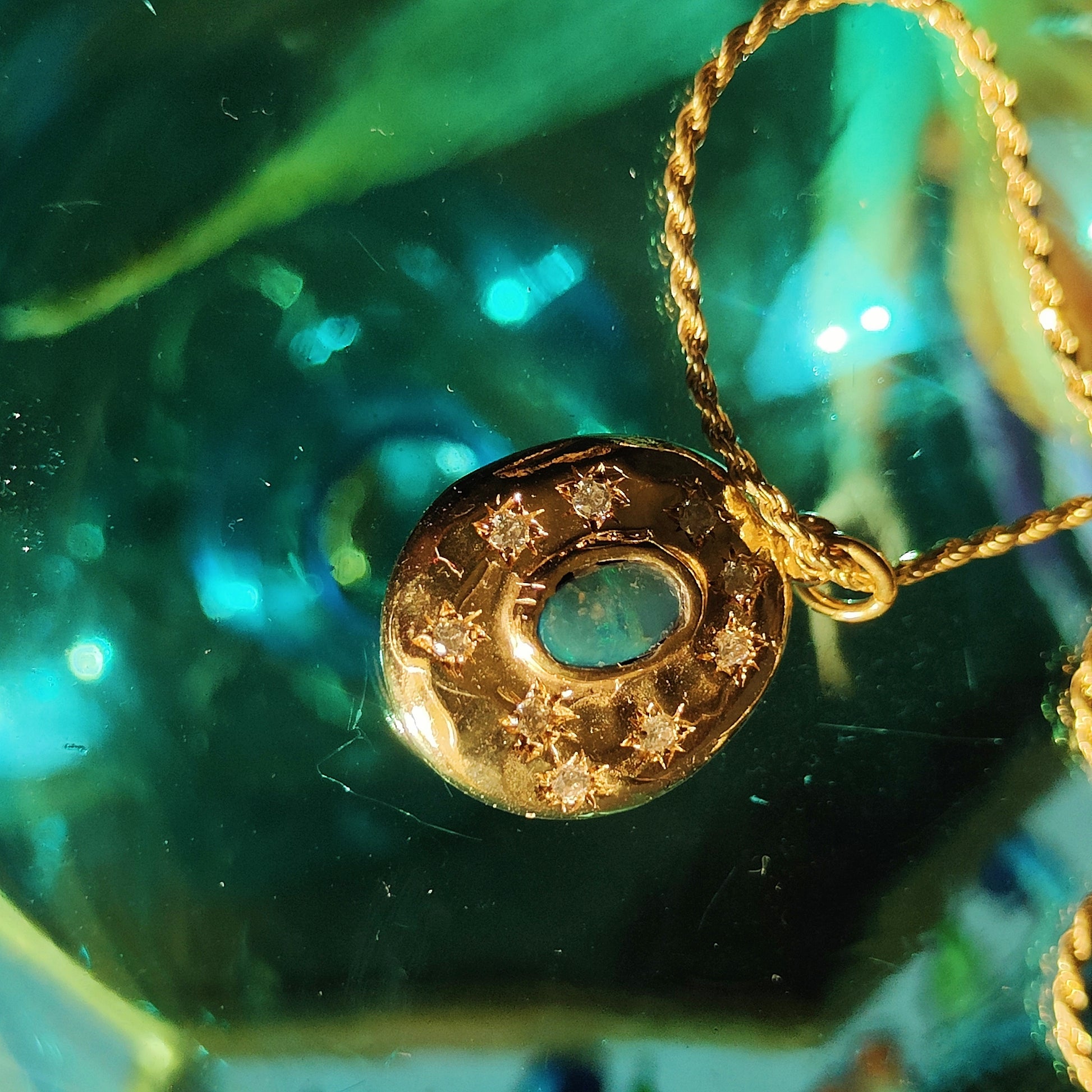 Stupenda collana in argento placcato oro 3 micron (*), con catena torchon e ciondolo con opale doppietta australiano e zirconia, che rappresentano perfettamente un cielo stellato da portare sempre con sè.