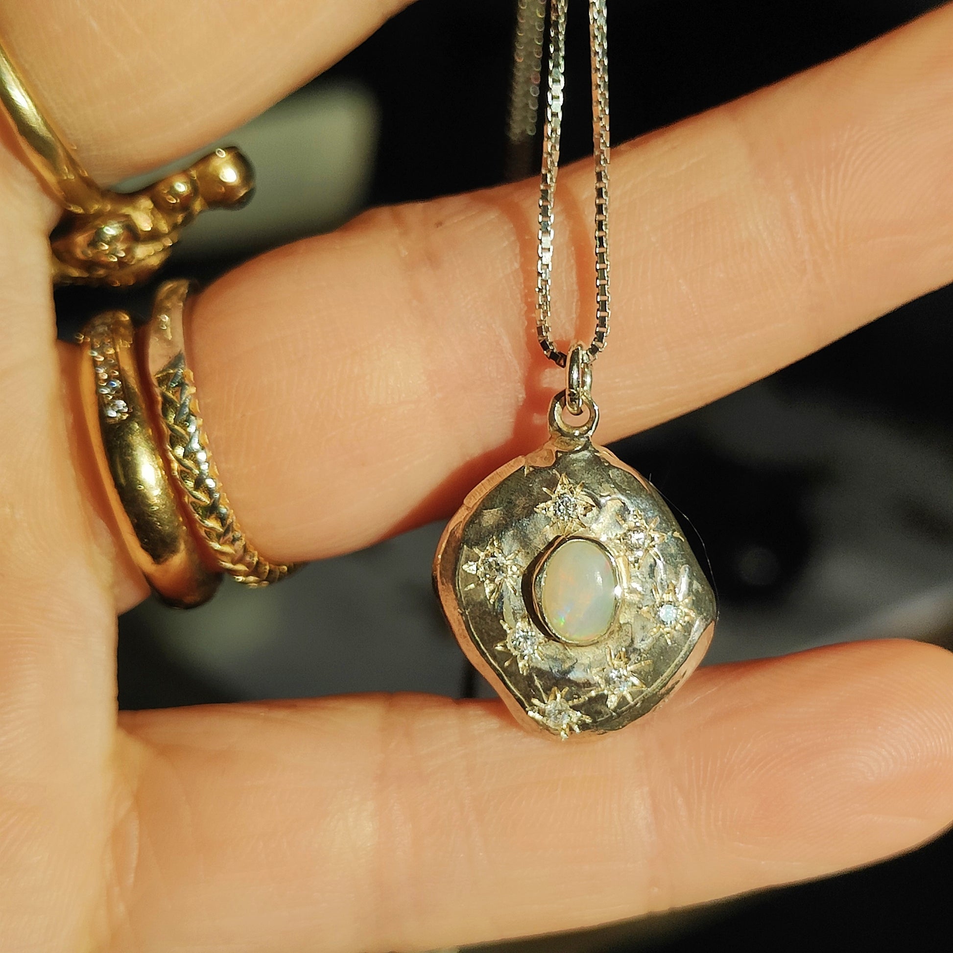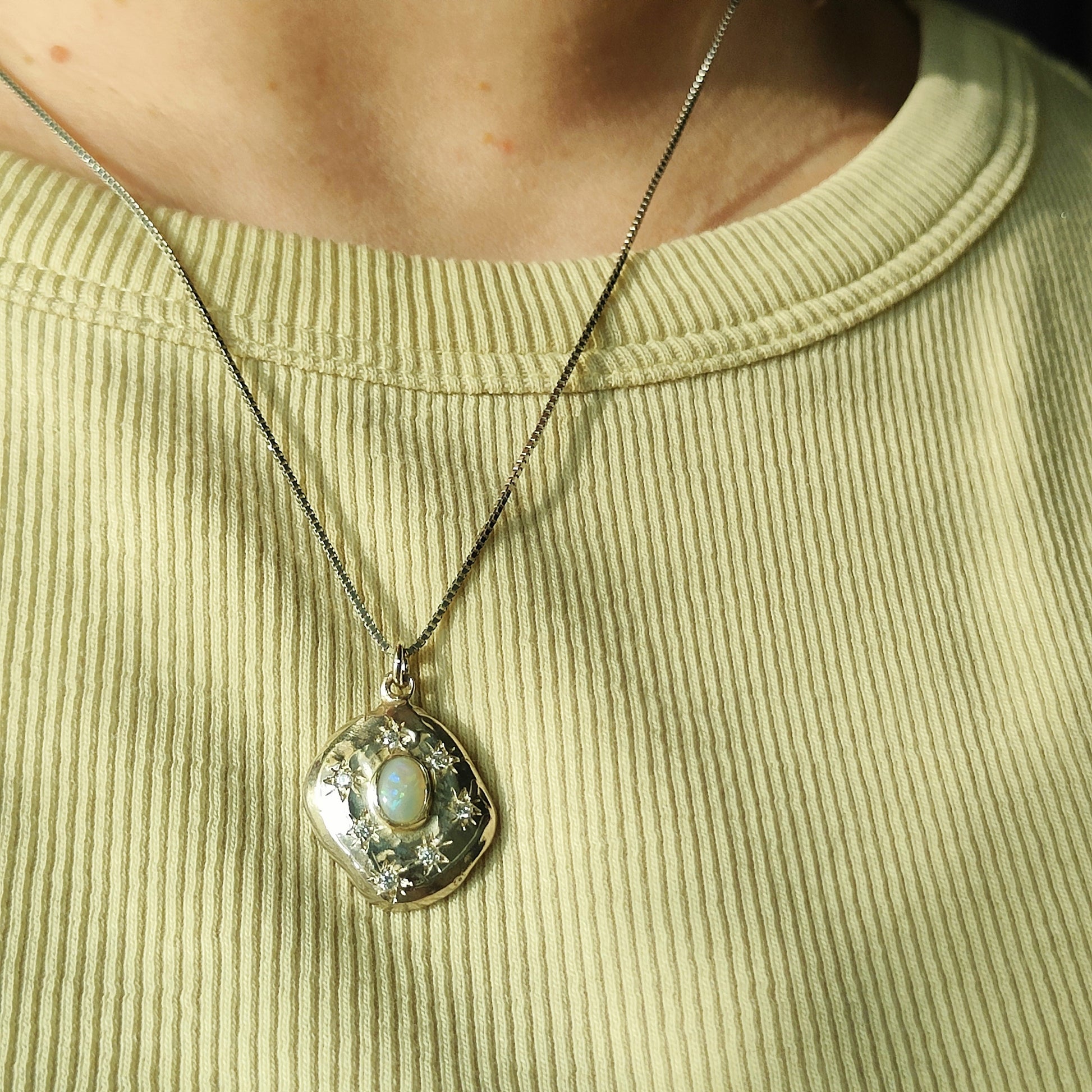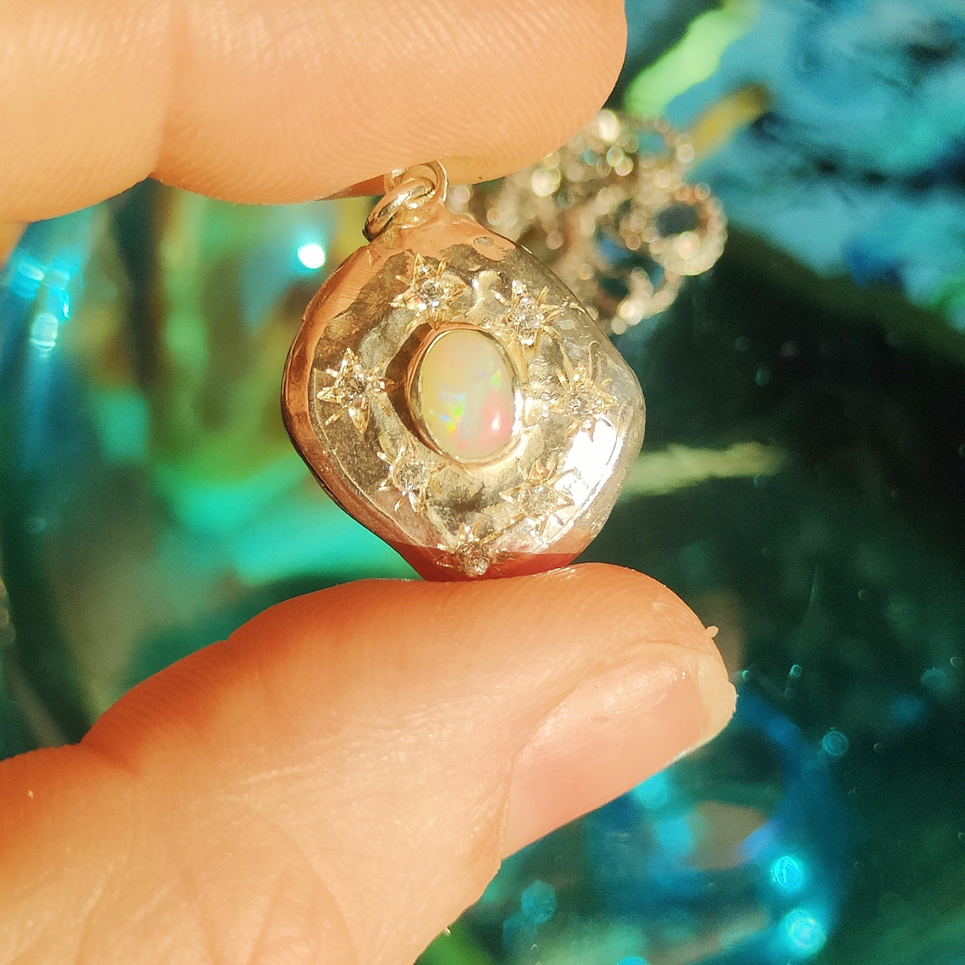 Stupenda collana in argento placcato con catena serpentina e ciondolo con opale australiano e zirconia, che rappresentano perfettamente un cielo stellato da portare sempre con sè.
