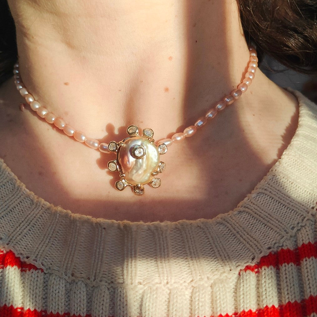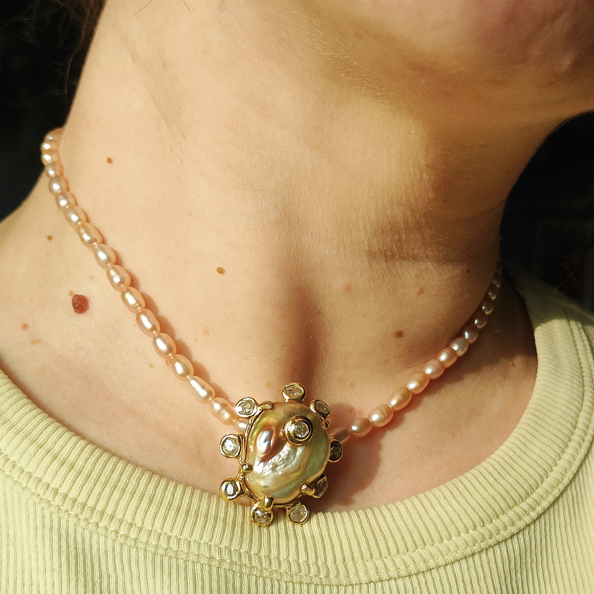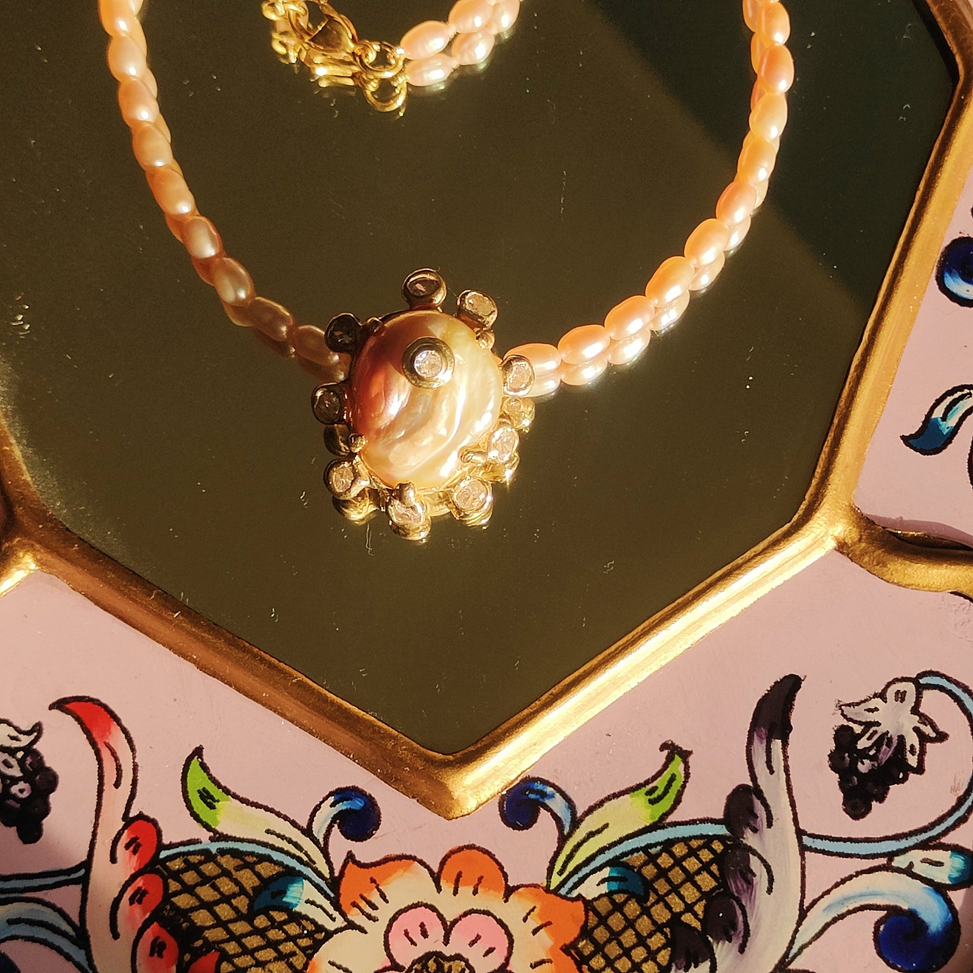 Un filo di perle rosa, di origine naturale, sono accostate al ciondolo centrale, realizzato in bronzo giallo e con una perla barocca dai riflessi cangianti, circondata da zirconia e con anche incastonato uno zircone. Un pezzo davvero eccezionale che difficilmente vi farà passare inosservate!
