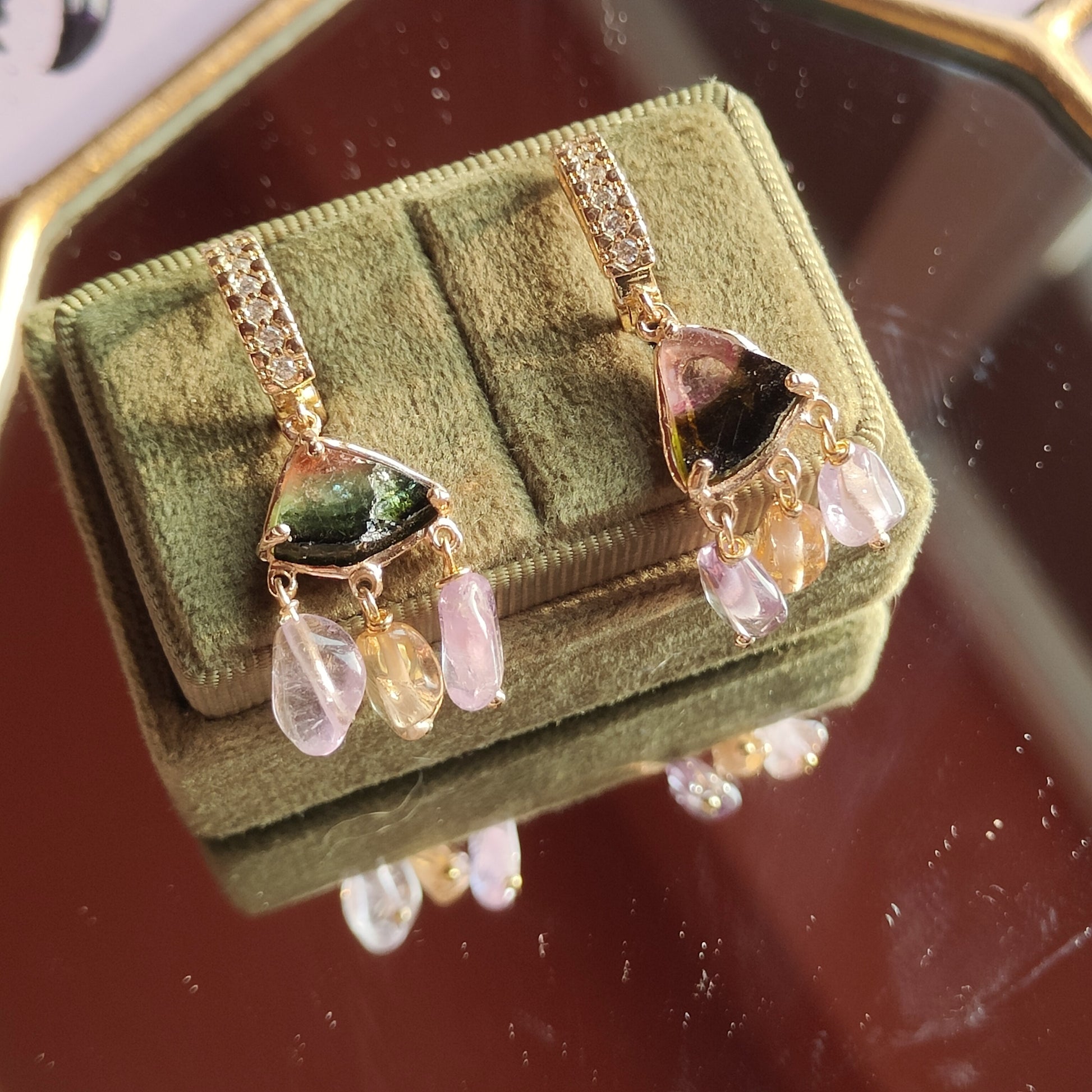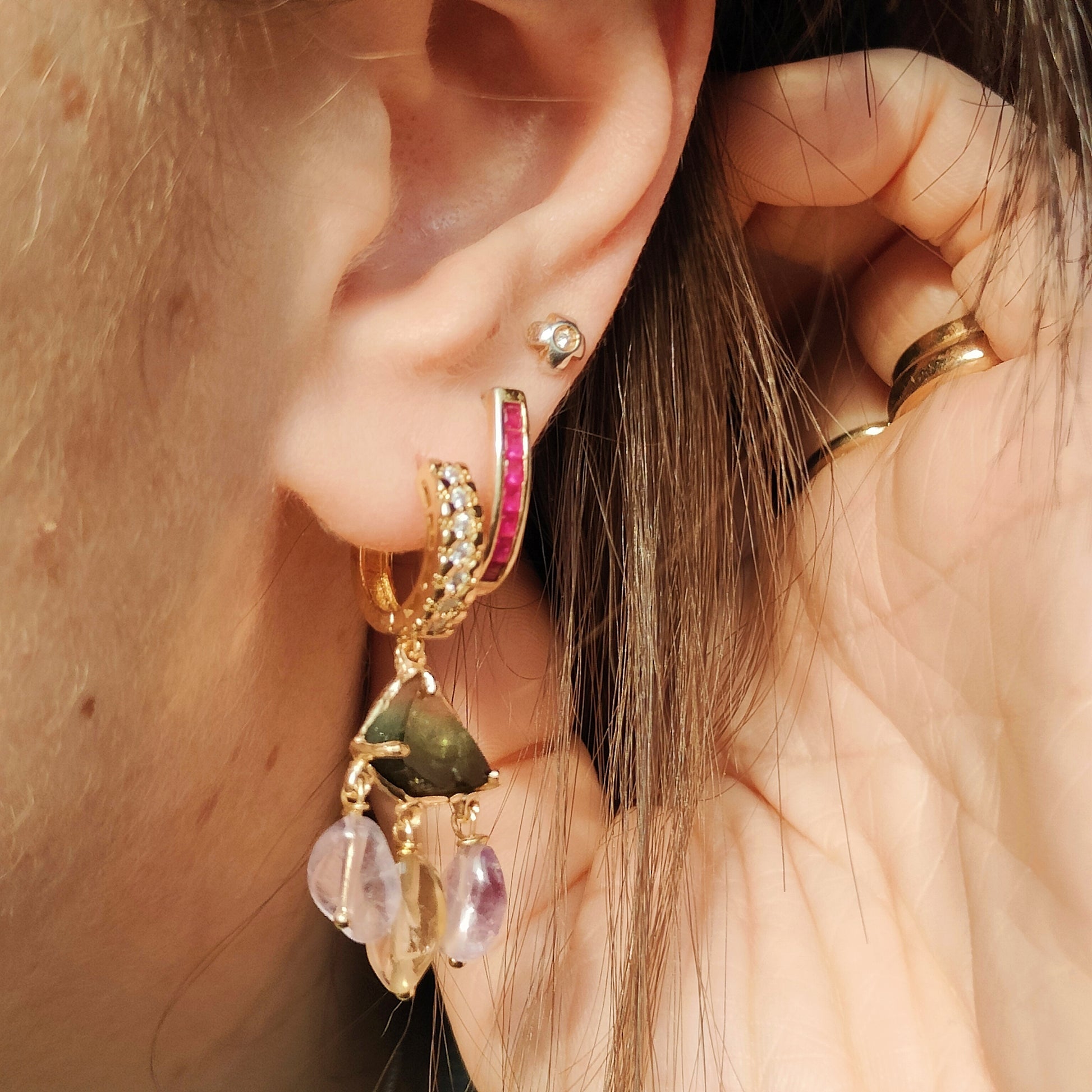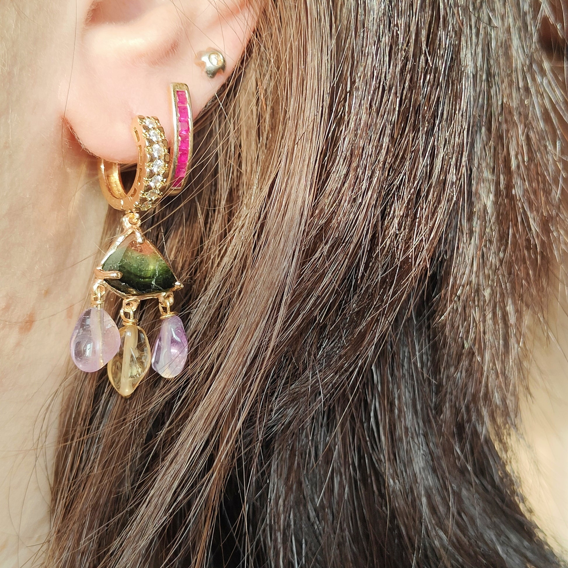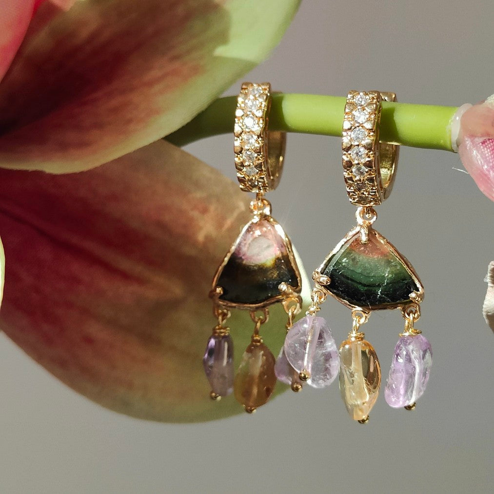 Questi orecchini a cerchio, devono il loro nome ha una particolare tormalina, la tormalina watermelon! La bellezza di questa pietra sta proprio nelle fasce di colore che caratterizzano la sua composizione e che richiamano proprio una fetta di anguria!